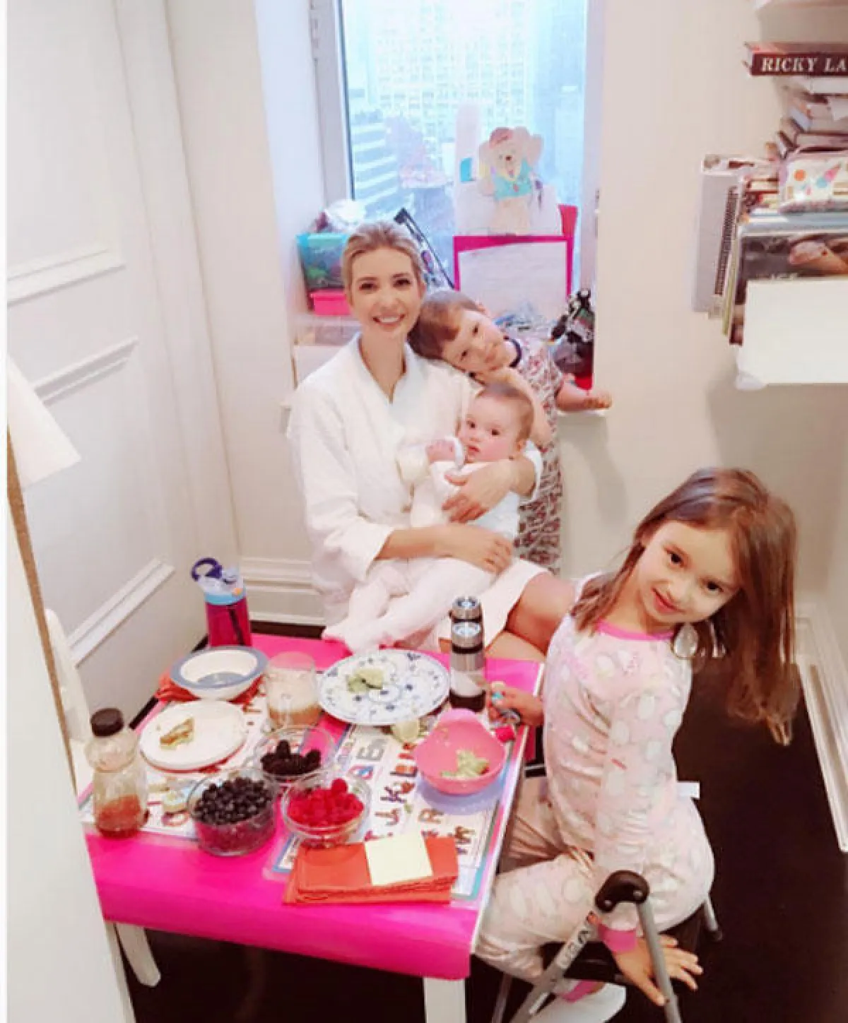 تعودت إيفانكا على أن توازن بين العمل والأمومة منذ أنجبت طفلين خلال 27 شهراً، تقول: "أنا على دراية بطريقة تحميمهما ووضع الحفاضات لهما وكيفية إمساك طفل دون خوف من وقوع حادث... أشعر بأني محترفة!. لكنها صرحت في وقت سابق لصحيفة ساوث تشاينا مورنينج بوست بأنها عينت مربية صينية للمساعدة في شؤون أرابيلا عندما عادت إلى المكتب بعد أسبوع من ولادتها.