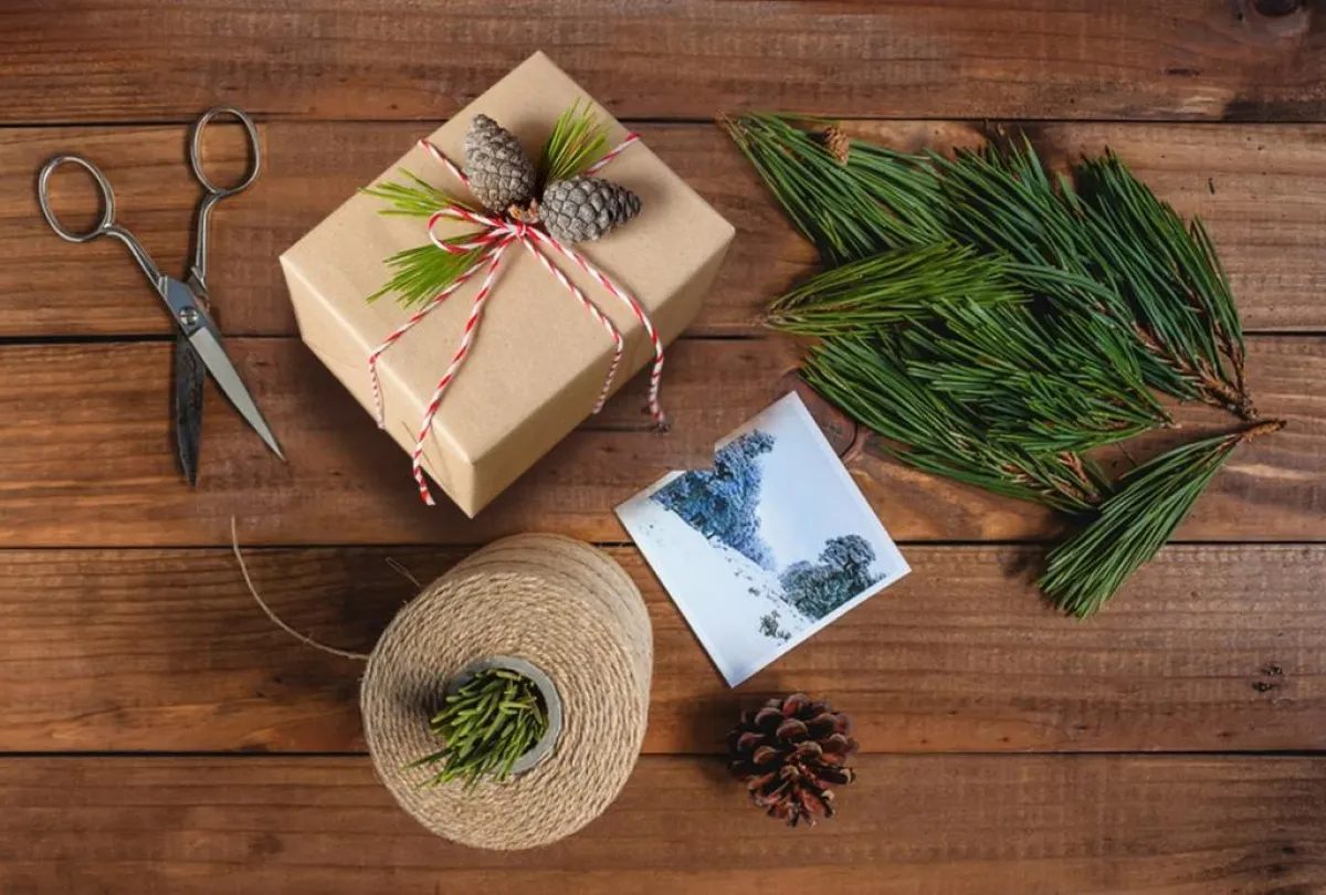 1. يمكن تغليف الهديّة، بورق الأشجار أو النباتات. ولمزيد من التميّز، يحلو لصق كوز من الصنوبر على العقدة.