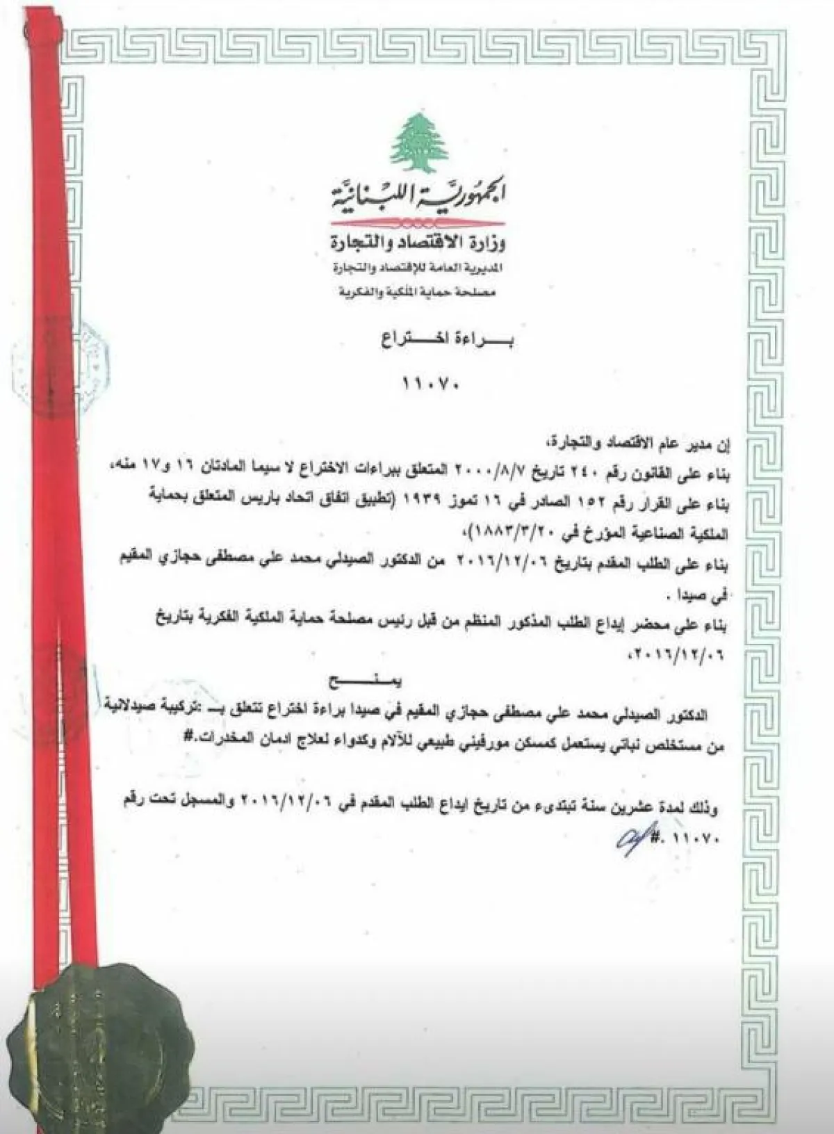 نال الدكتور الصيدلي محمد علي مصطفى حجازي براءة اختراع من وزارة الاقتصاد والتجارة في لبنان، تتعلّق بتركيبة صيدلانية من مستخلص نباتي يستعمل كمسكن مورفيني طبيعي للآلام وكدواء لعلاج الإدمان من المخدرات وذلك لمدّة عشرين عاماً .حجازي حائز على درجتي البكالوريوس والماجستير في العلوم الصيدلانية من جامعة بيروت العربية، وهو الآن في مرحلة الدكتوراه ويستعدّ لمناقشة أطروحته التي ستكون تحت إشراف كل من عميد الكلية الأستاذ الدكتور عبد الله اللقاني والأستاذة الدكتورة مها أبو العلا، رئيسة مجلس قسم العلوم الصيدلية.