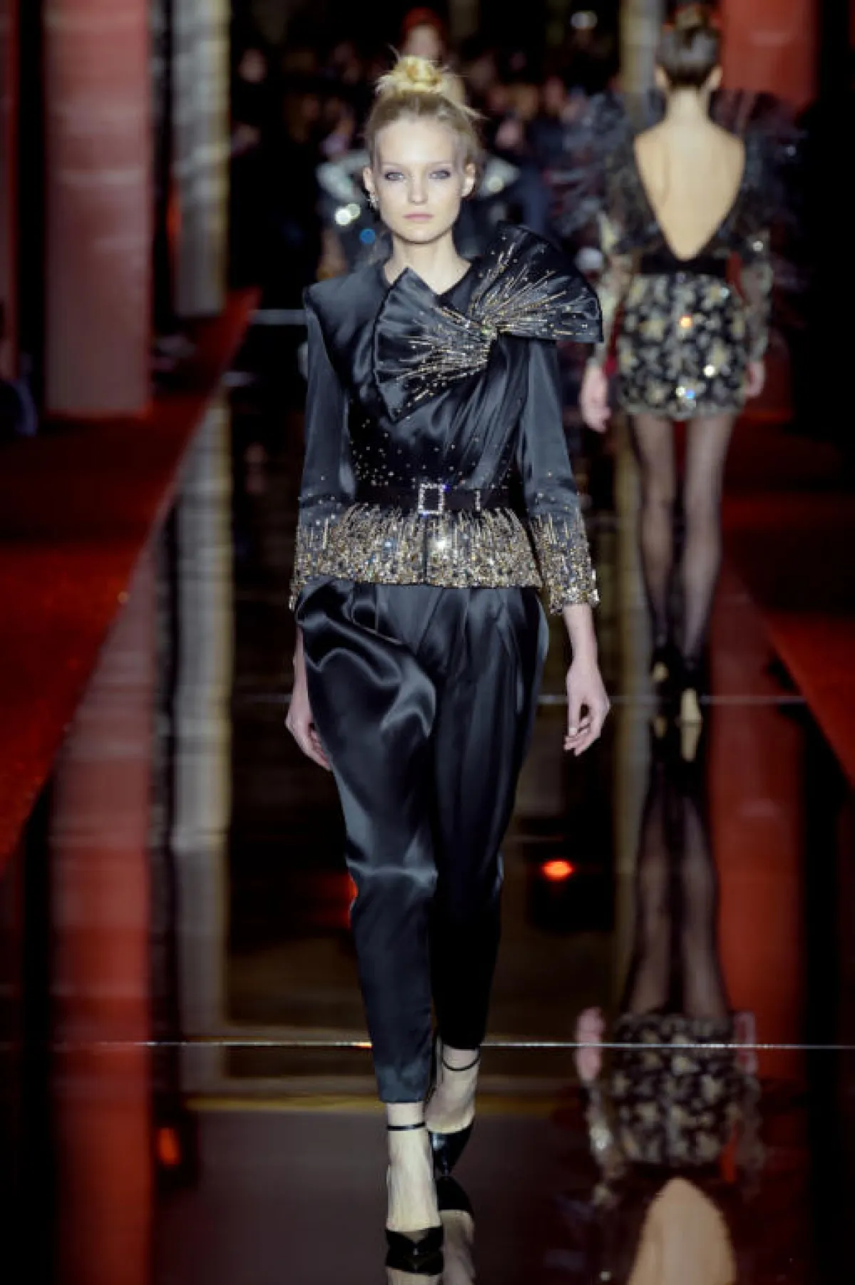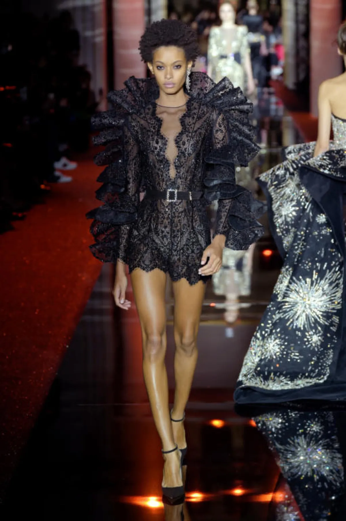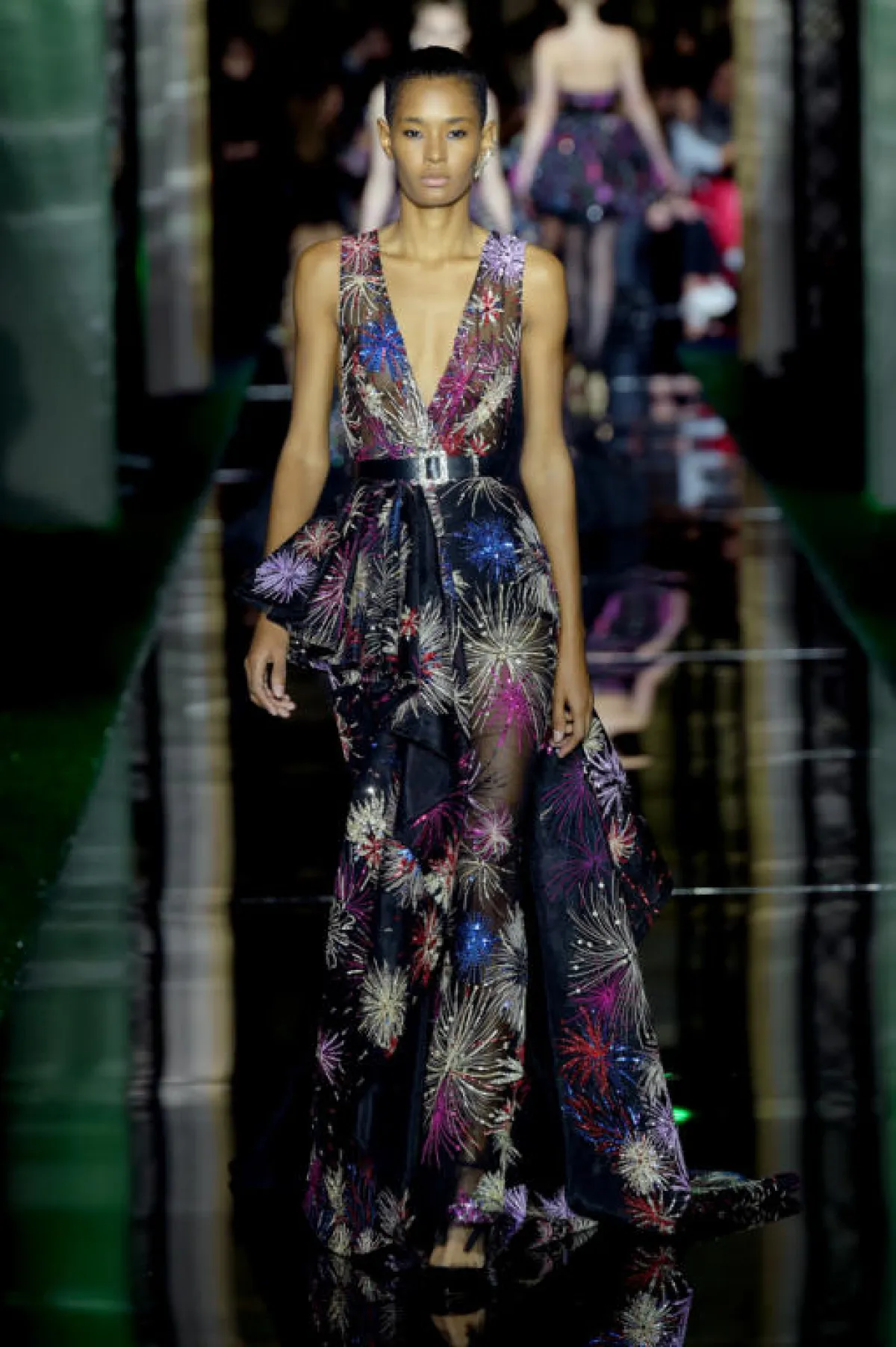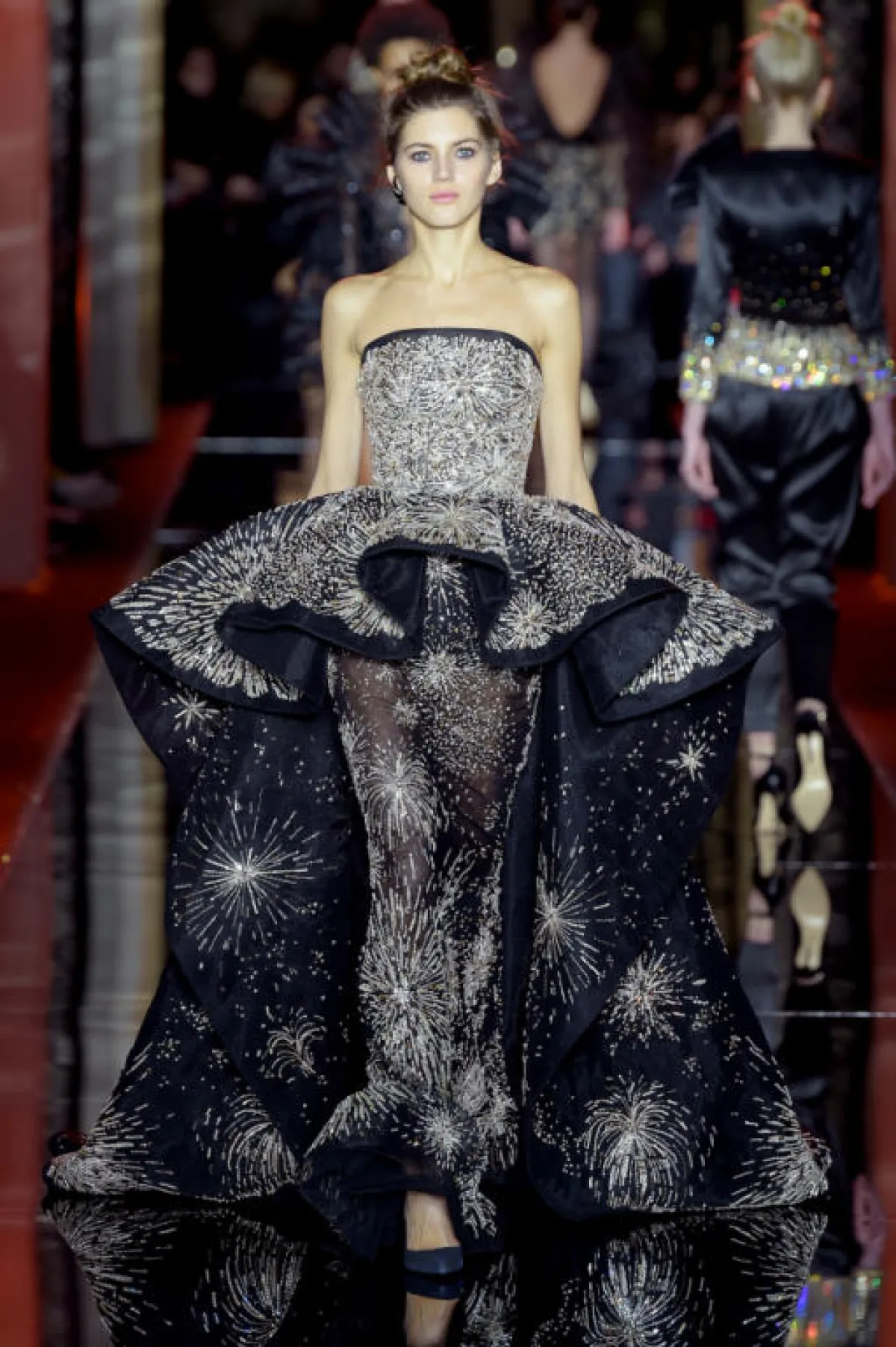 وعدنا بعد ذلك الى الأجواء السحرية مع مجموعة "زهير مراد" Zuhair Murad والتي بدت متنوعة إلى حد كبير شاهدنا فيها الفساتين القصيرة المستوحاة من عالم الرو أند رول، والفساتين سهرة التي ذكرتنا ببريق حقبة الثمانينيات مع ألوانها الصاخبة التي تمازجت بطريقة ذكية، وقد ركز على ابراز الشكل الأنثوي مع تحديد الخصر من خلال الأحزمة التي باتت جزء من هوية دار "زهير مراد" Zuhair Murad.