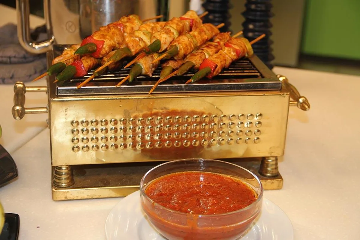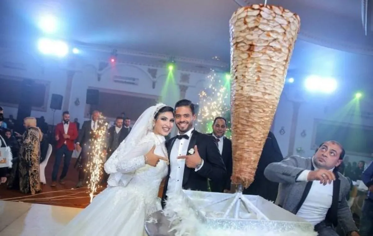 وتظهر الصورة كيف استبدل النجم وزوجته قالب الحلوى في حفل زفافهما بسيخ شاورما.