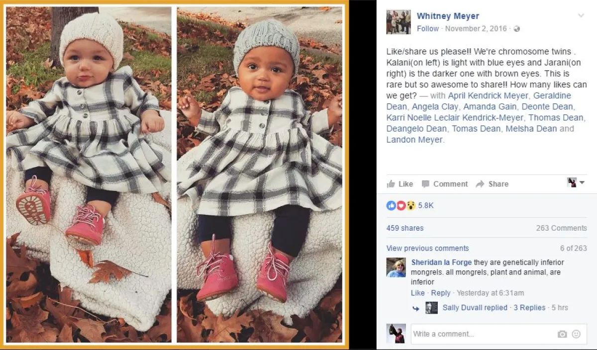 ووفقًا لـ «هافينغتون بوست» عربي، قالت الأم على إحدى الشبكات الاجتماعية: "إن الطفلتين ولدتا في أبريل/نيسان من عام 2016، وتقول إنهما توأمتان من ثنائي العرق: «على اليسار» بيضاء وزرقاء العينين، بينما «على اليمين» سمراء بنية العينين.