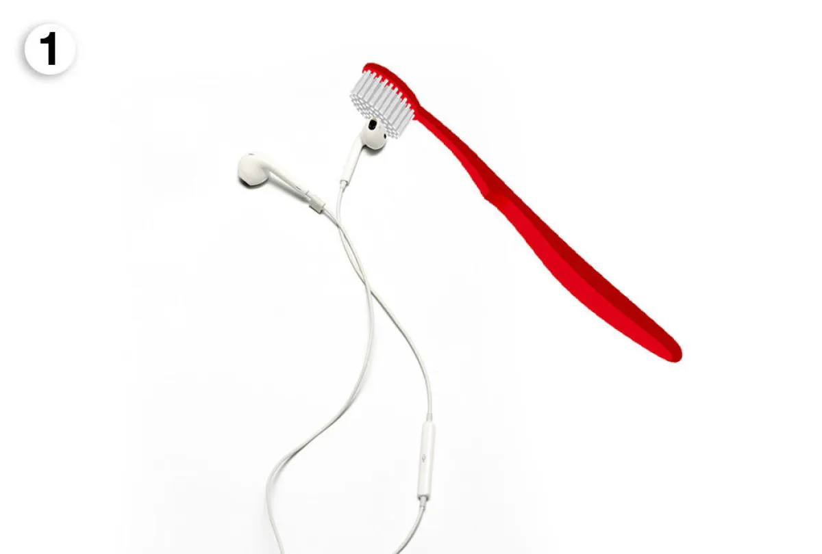 1. يُنفض الغبار عن رأس سماعة الأذن، بواسطة فرشاة الأسنان. وتكرّر العمليّة في السمّاعة الثانية.