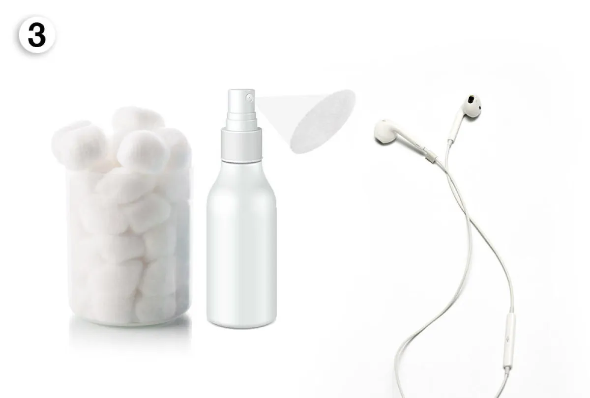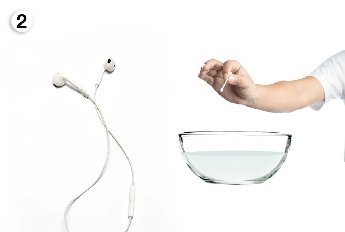2. يُغمس أحد أعواد القطن في مزيج الماء المضاف إليه سائل الجلي، ليمسح به مكان أصداء الصوت الموجود في رأس السمّاعة. وتكرّر العمليّة في السمّاعة الثانية.