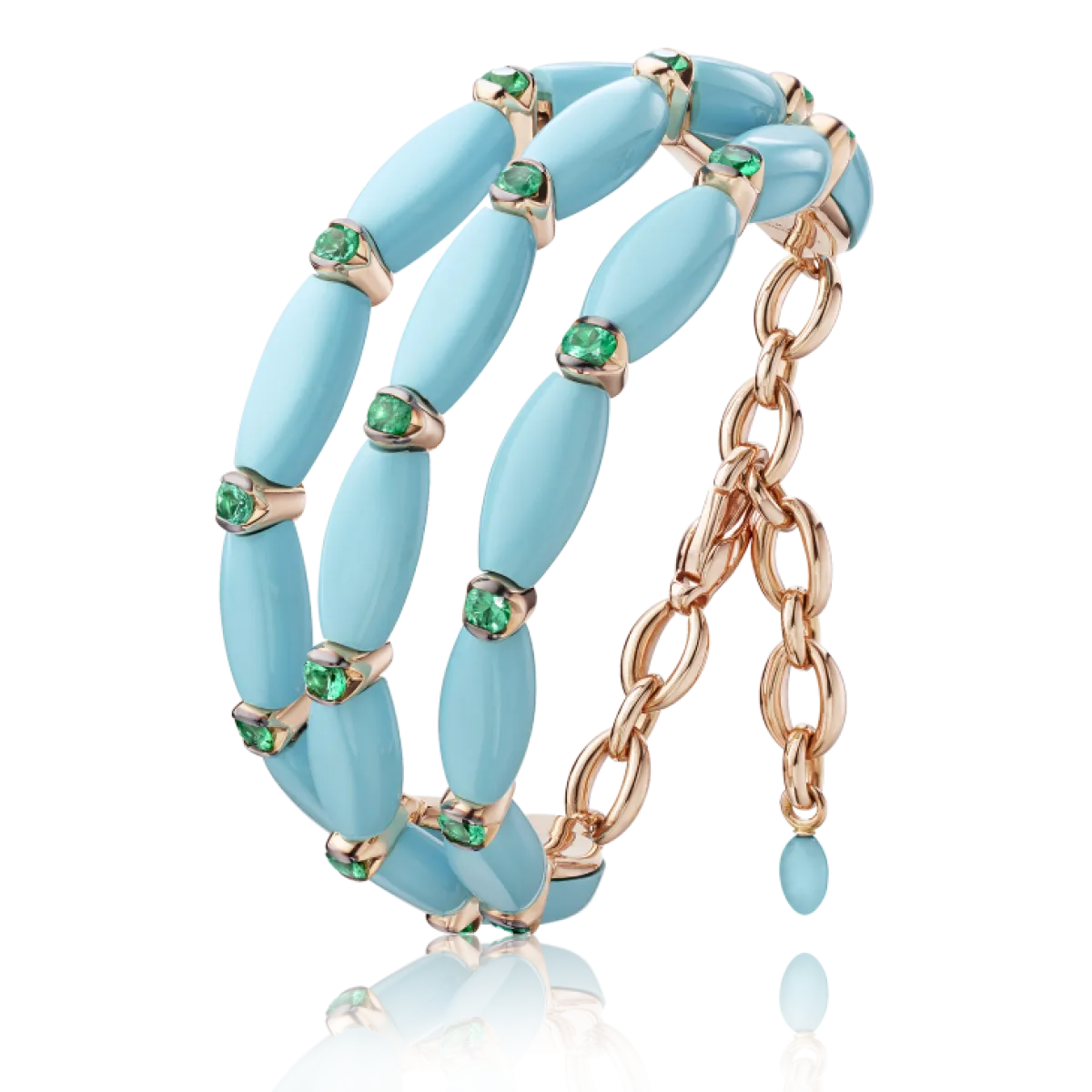فمن خلال جولة قمنا بها على أبرز دور المجوهرات العالمية، لاحظنا أن غالبيتها استخدمت حجر الفيروز في صناعة بعض قطع المجوهرات وترصيعها. فاختارت بولغاري Bulgari تزيين بعض الأقراط بقطع من الفيروز ذات التقطيع الهندسي المميز. أما شوبارد Chopard فقد اختارت تصميم القلب المصنوع من الفيروز والذهب الأبيض لعقد من مجموعتها، بالإضافة إلى أقراط بتصميم القلب أيضاً. ورأينا تقطيعاً مميزاً للفيروز اعتمدته دي غريسوغونو De grisogono في صناعة سوار من الذهب الوردي والزمرد من مجموعة Florinda Collection. أما ديور Dior فقد استخدمت الفيروز كقاعدة لتصميم عقدها المصنوع من الذهب الأصفر والألماس من مجموعة Rose des vents. وغيرها من أبرز دور المجوهرات العالمية التي اعتمدت على الفيروز في صناعة قطعها وترصيعها مثل باميلاتو Pamellato وبياجيه piaget وفان كليف أند أربلز Van Cleef & Arpels وغيرها.