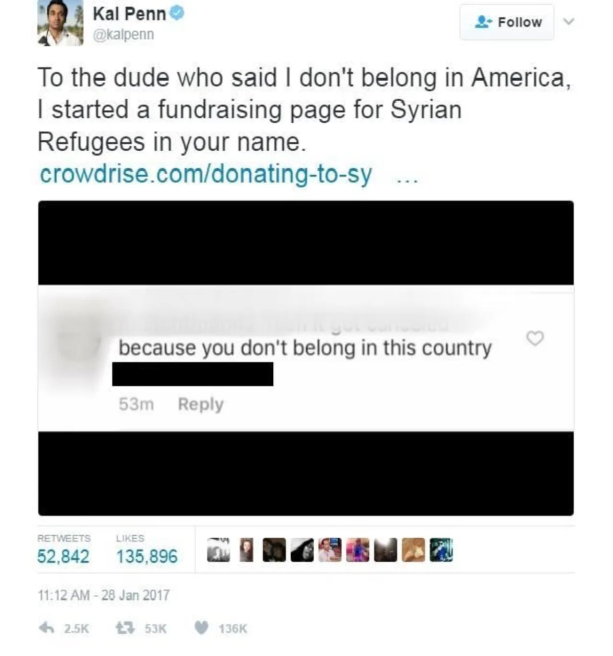 بعد تلقّي الممثل الأمريكي – الهندي الأصل كال بين Kal Penn، رسالة عبر تويتر تقول: "أنت لا تنتمي إلى هذا البلد"، بدأ حملةً لجمع التبرّعات تحت شعار"سنحوّل التعصّب إلى حب".