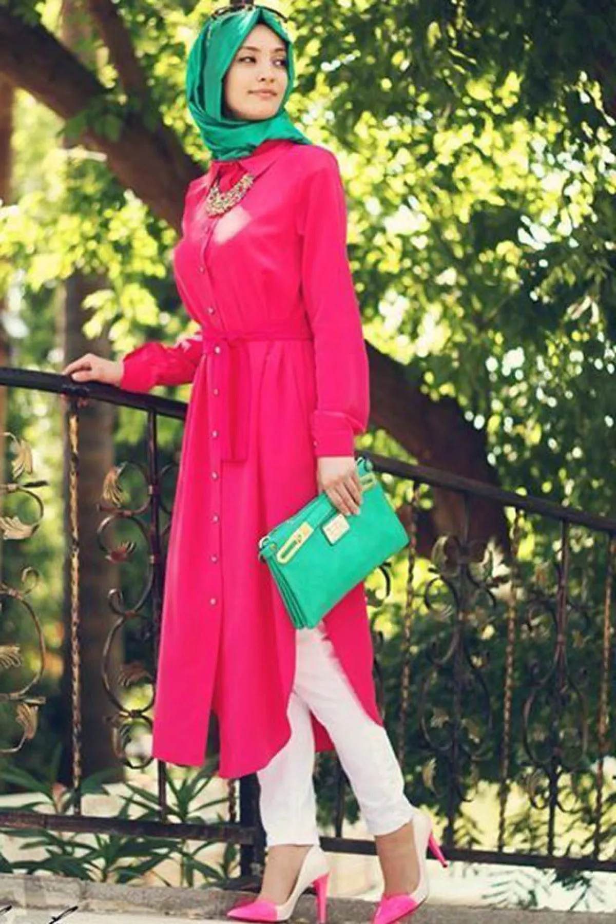 - جربي ارتداء الأحزمة مع القميص الطويل وكذلك العقود الطويلة لأنها ستمنحك إطلالة متجددة مع الحجاب.