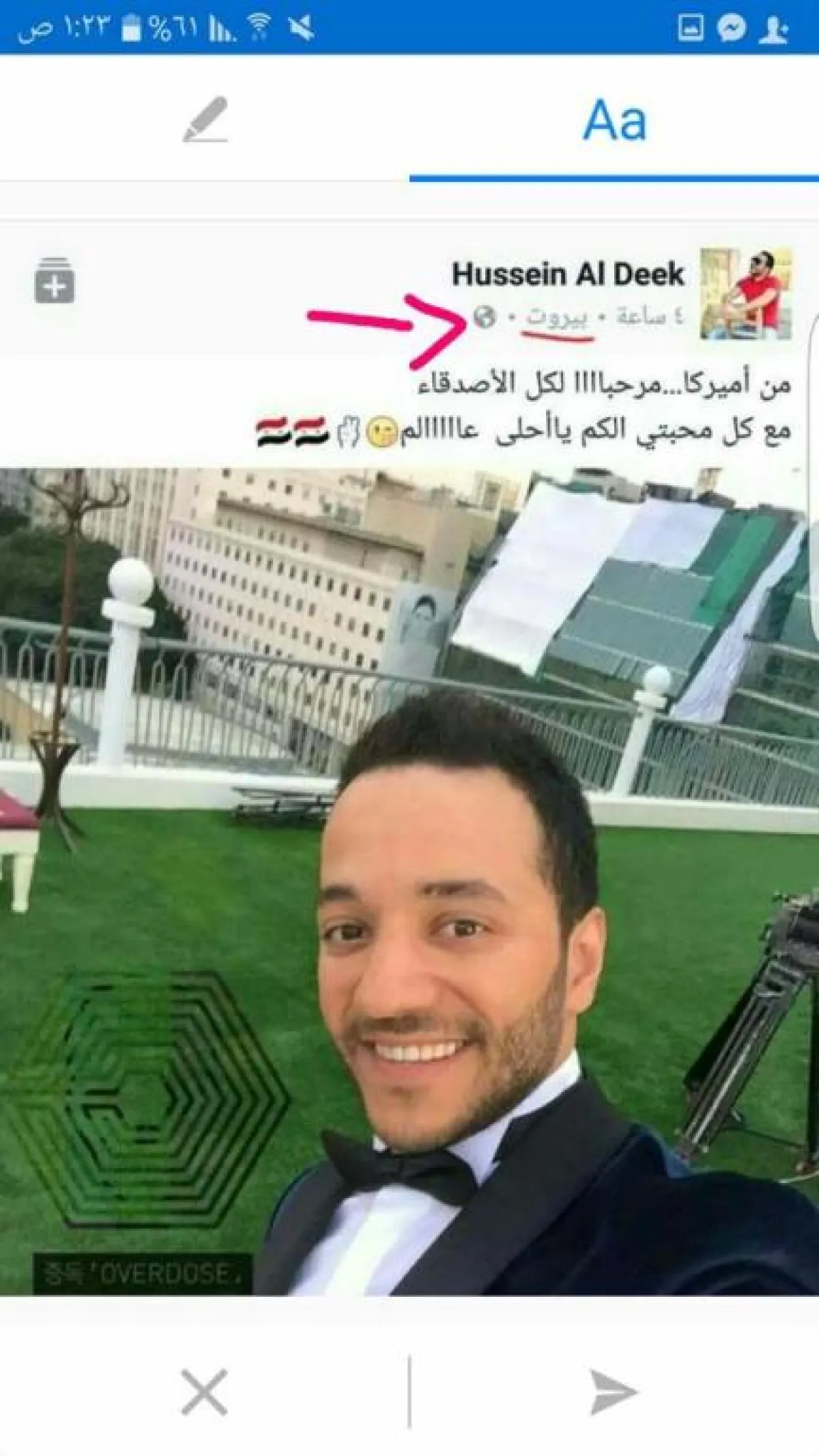 نشر الفنان حسين الديك صورة له عبر حسابه الشخصي على الفيس بوك، وكتب عليها: "من أمريكا مرحباً لكل الأصدقاء مع كل محبتي لكم يا أحلى عالم"، الصورة التي تناقلها ناشطون عبر السوشيال ميديا، وكذبوا بها الفنان حسين الديك؛ كون اللوكيشن الذي نشرت به الصورة هو في بيروت، الأمر الذي أثار تساؤل الكثيرين: ما هو السبب وراء نشر هذه الصورة؟