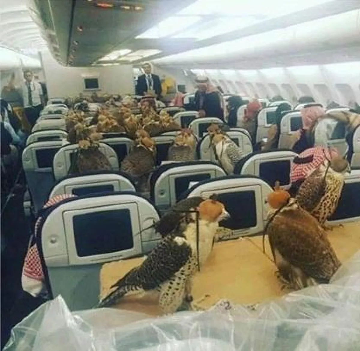 تداول رواد على مواقع الواصل الاجتماعي وبشكل واسع خلال الساعات الماضية، صورة لطائرة تُقلّ أكثر من 80 صقرًا، تستقر على مقاعد الركاب مع أشخاص يظهرون بالزي الخليجي، مشيرين إلى أنها في رحلة سفر إلى أميركا.
