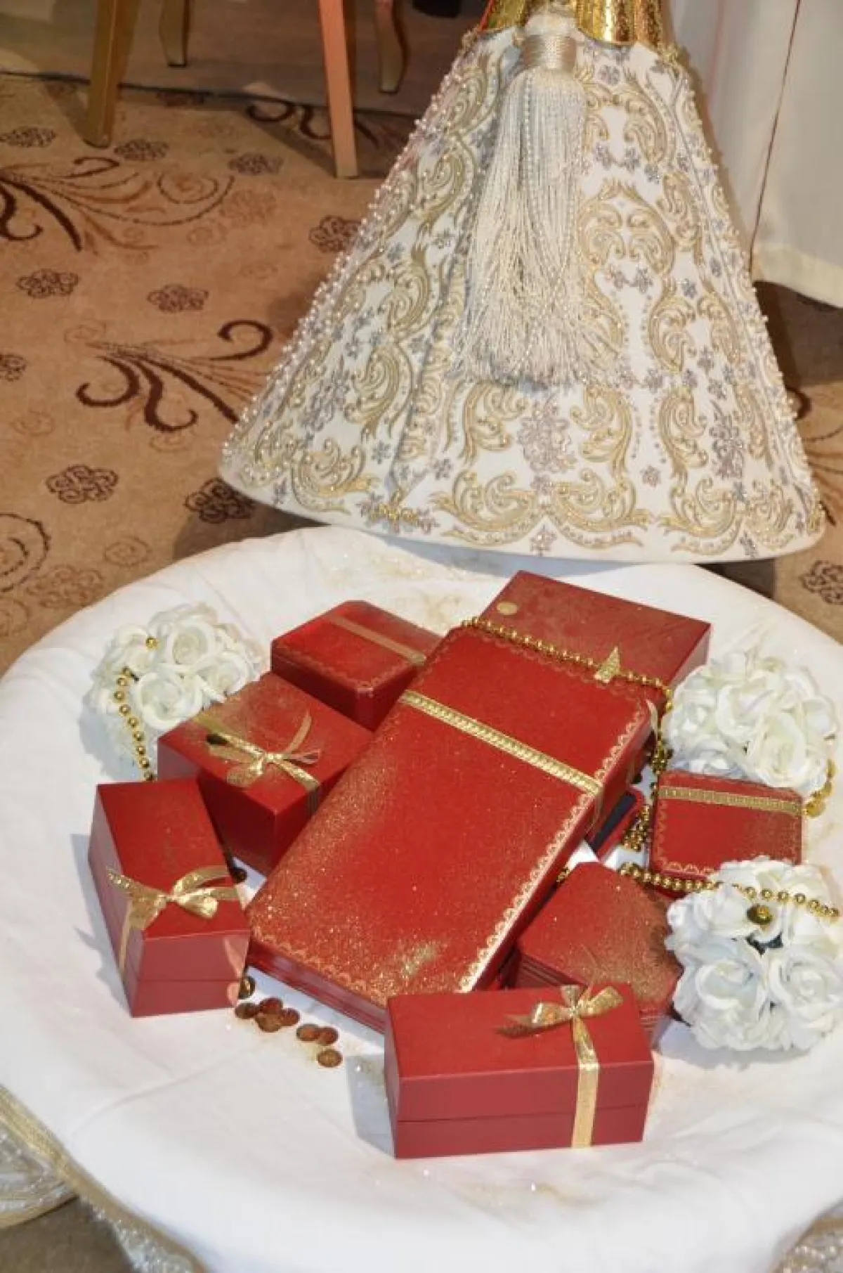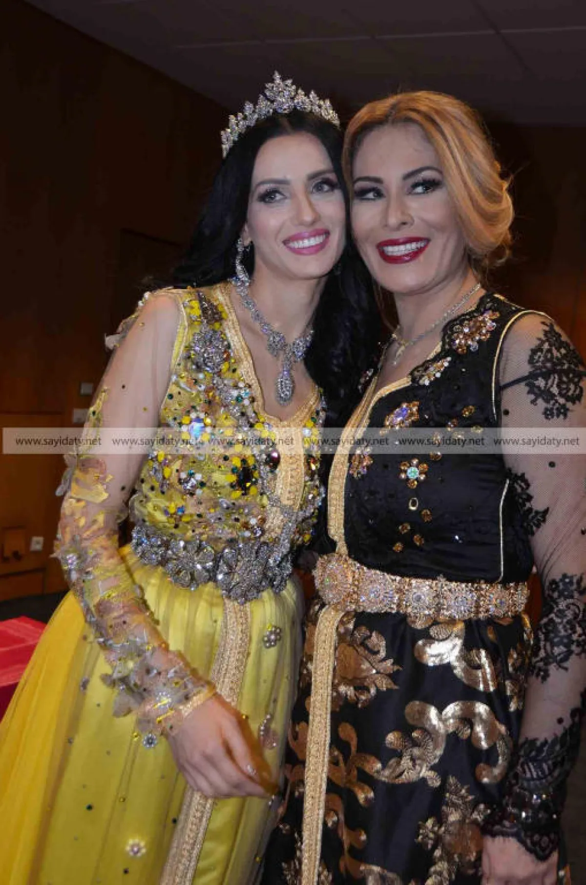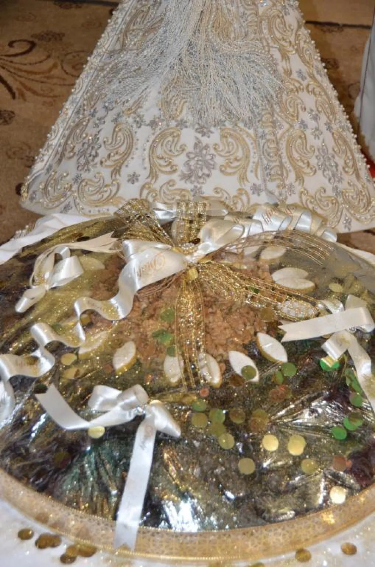 ظهر العروسان في أول إطلالة بزينة العمارية اختارت فيها العروس قفطاناً أصفر براقاً مزخرفاً بالعقيق والجواهر الملونة مع تاج ومجوهرات من البلاتين الحر، وهي محمولة على الأكتاف. بينما أطل العريس ببدلة عصرية سوداء وانسجم في جو الموسيقى المغربية التي زفت العروس بحماس على إيقاع غناء عبدو الصويري وباقي فرق الدقايقية وعيساوة.