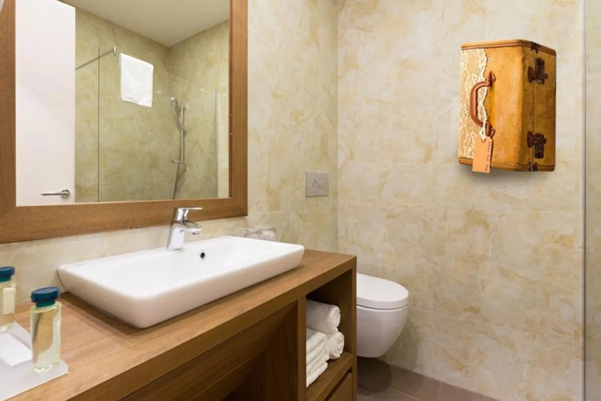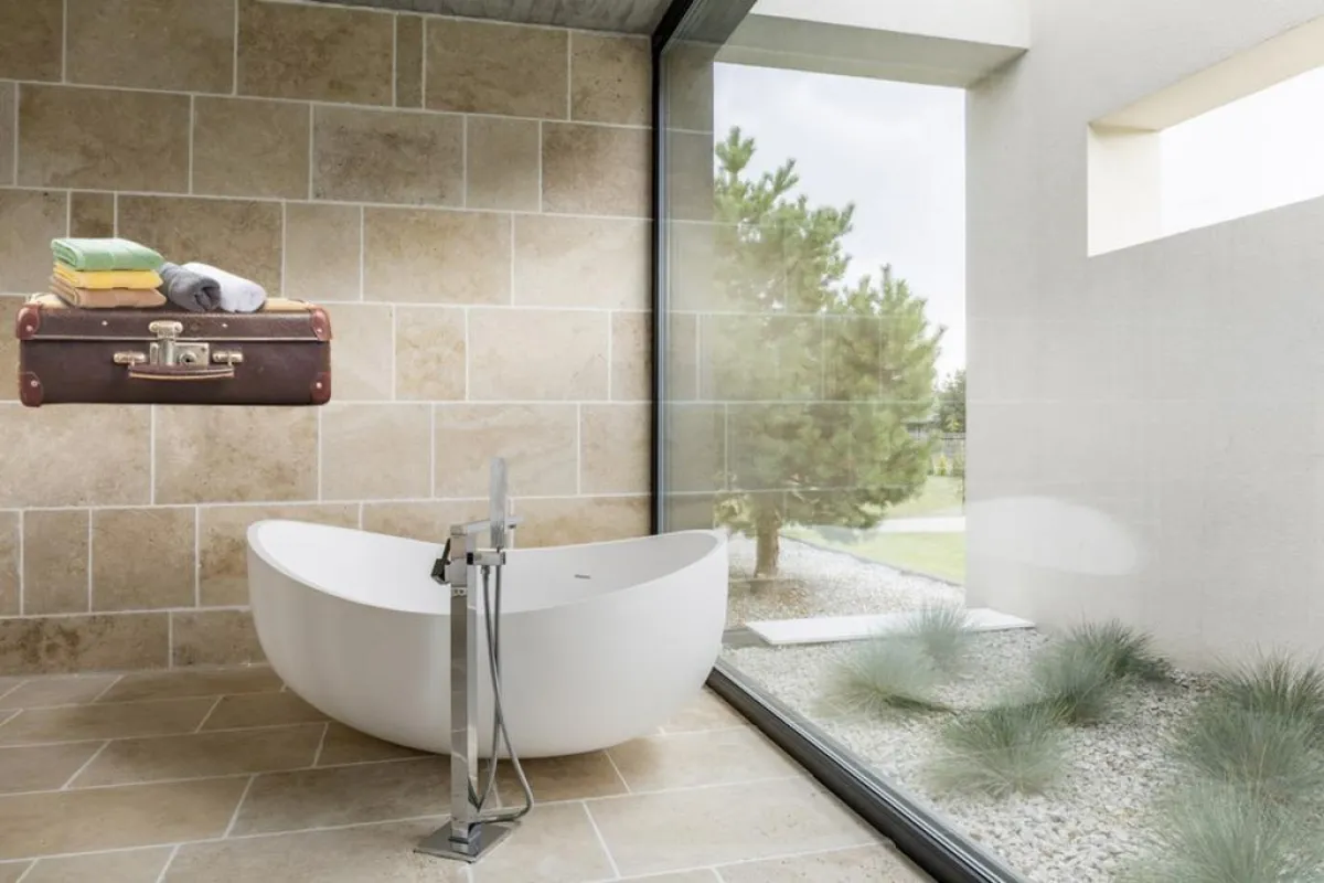 في الحمّام، يمكن أن تُثبت شنطة السفر على الجدار، مع استخدامها كحامل للمناشف