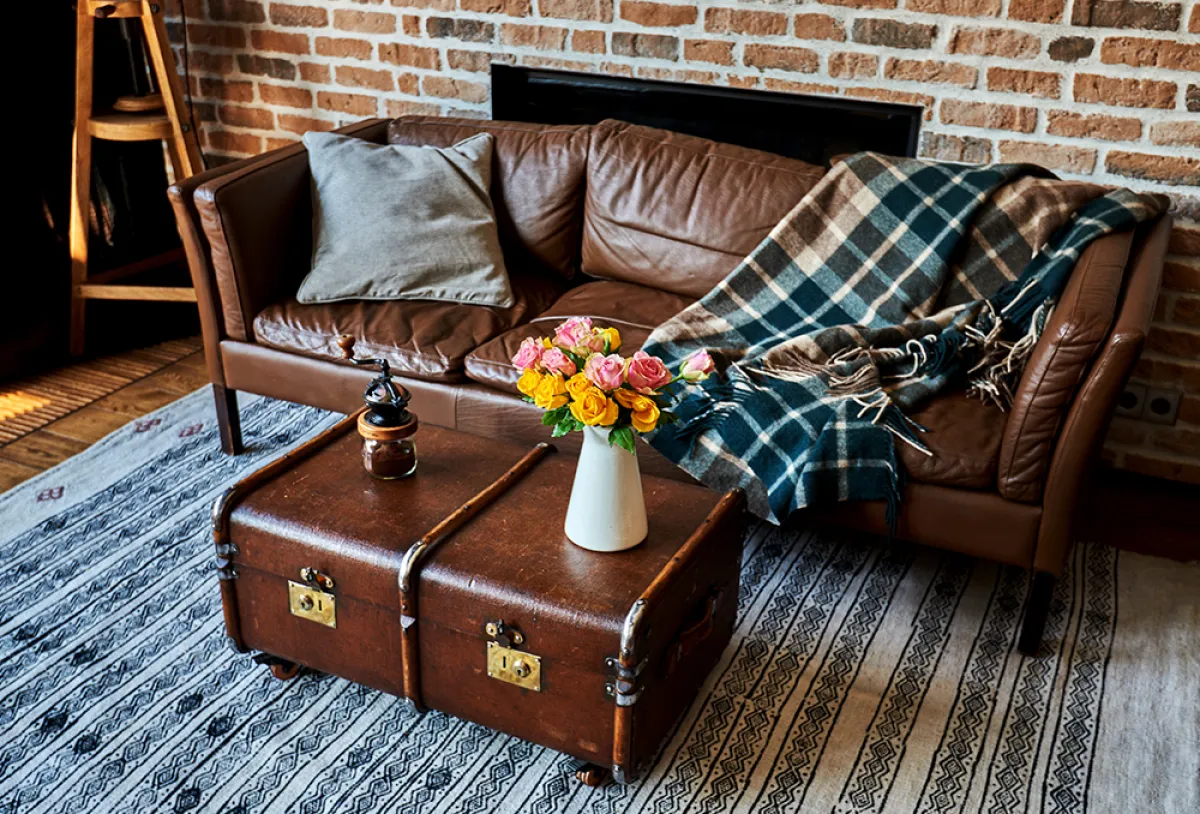 من الأفكار المقترحة: أن تتوسّط شنطة السفر غرفة المعيشة، على أن يحمل سطحها "اكسسوارًا"