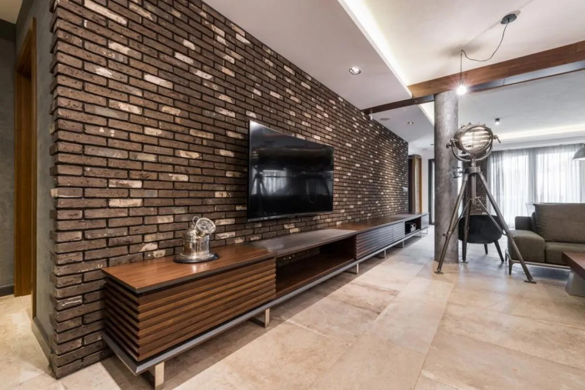| يمكن أن توضع شاشة التلفاز ضمن وحدة تخزين مزوّدة بلوح معدّ من الخشب أو الزجاج يخفي التلفاز عند عدم الحاجة إليه، ليتحوّل الجدار الى قطعة ديكور، أو أن تتكئ الشاشة إلى خزائن سفليّة، على أن تتوزّع على الجدار خلفها قطع من الحجر.