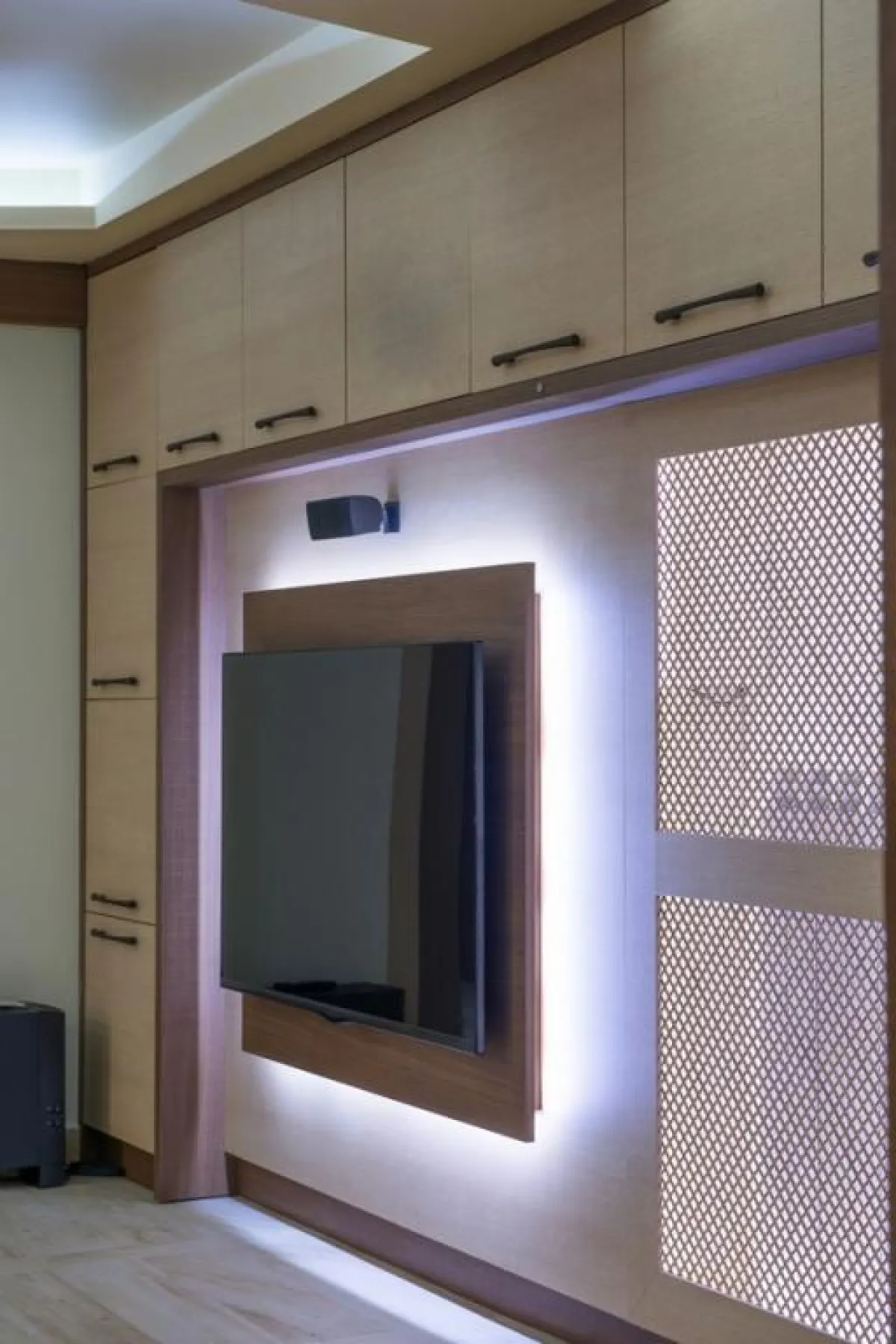 | من الجاذب كسوة الخلفيّة التابعة للشاشة والجدار بألواح الخشب، على أن تتفاوت مستوياتها، مع تثبيت وحدة تخزين على الأرض.