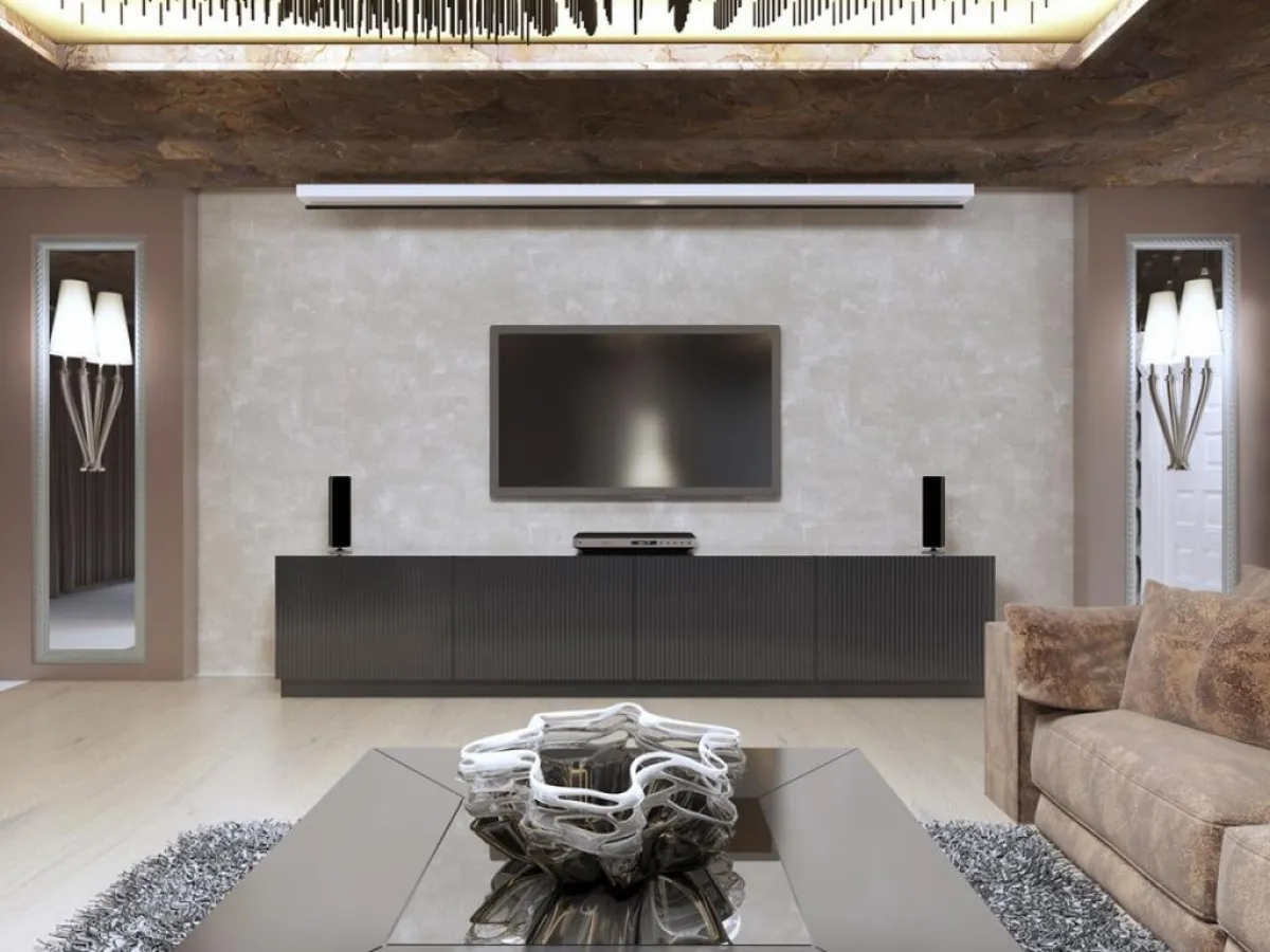| يمكن إبراز الشاشة على خلفيّة معدّة من الخشب، على أن تأتي وحدة تخزين تبدو كأنّها طائرة عند أسفلها. وفي هذا الإطار، يحلو طلاء الجدار بلون معاكس للخلفيّة الخشب، ولا مانع من اختيار لون جريء لأنه سيغطي جزءًا بسيطًا من الغرفة. مثلًا: إذا كان الخشب أبيض، يمكن طلاء الجدار بالأحمر أو الأخضر.