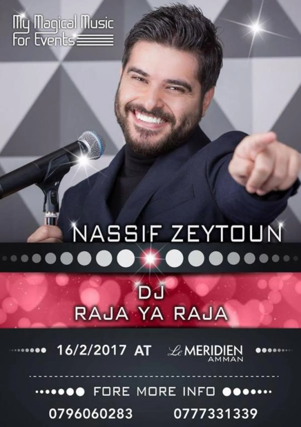 بمناسبة الفالنتاين (عيد الحب)، أعلن عن إقامة عدة حفلات في العاصمة الأردنية عمان، فستقام حفلة للفنان ناصيف زيتون يرافقه الدي جي (رجا يا رجا) وذلك بفندق الميريديان - عمان بتاريخ 16/02/2017.