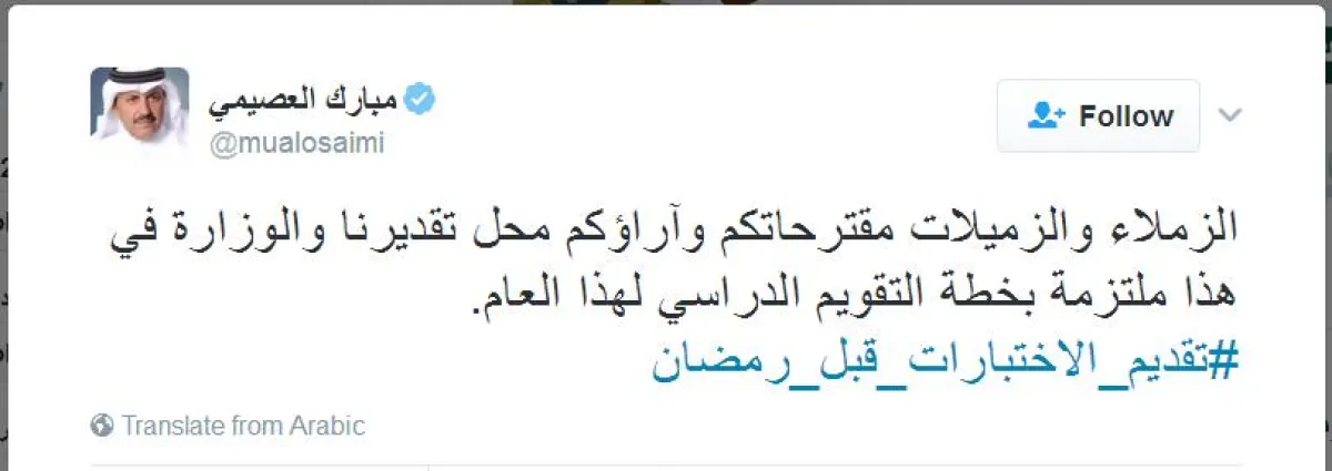 رداً على مقترحات، قدمها نشطاء على موقع التواصل الاجتماعي "تويتر" عبر "هاشتاق": "تقديم_الاختبارات_قبل_رمضان"، حول تقديم الاختبارات النهائية للفصل الدراسي الثاني لهذا العام إلى شهر شعبان مراعاة لخصوصية شهر رمضان المبارك، أكد المتحدث الرسمي باسم وزارة التعليم السعودية مبارك العصيمي في تغريدة عبر حسابه في "تويتر"، التزام الوزارة بخطتها، قائلاً: "الزملاء والزميلات مقترحاتكم وآراؤكم محل تقديرنا، والوزارة في هذا ملتزمة بخطة التقويم الدراسي لهذا العام".
