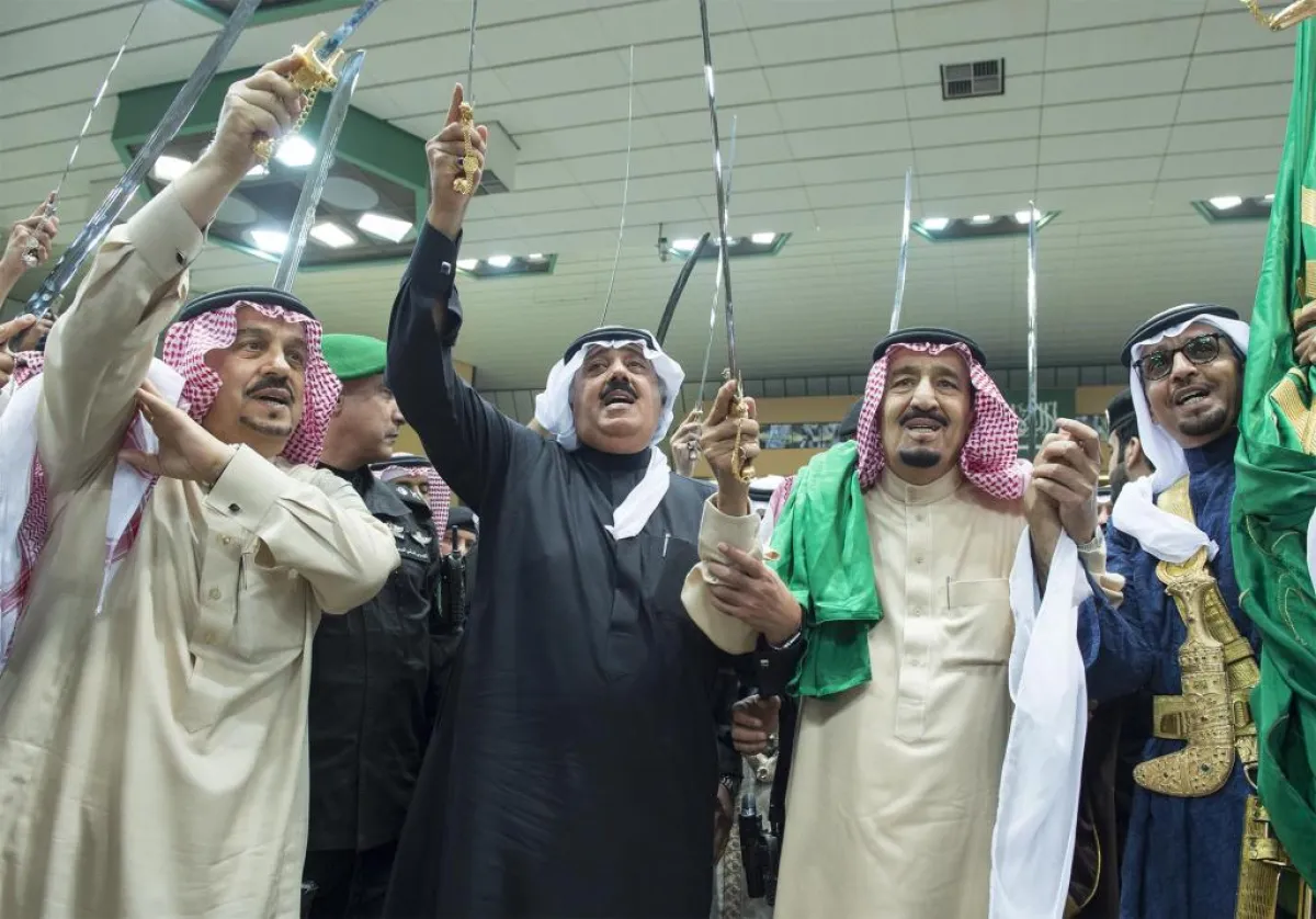 وبعد أن أخذ الملك سلمان مكانه في المنصة الرئيسية للاحتفال، بدأت العرضة السعودية.