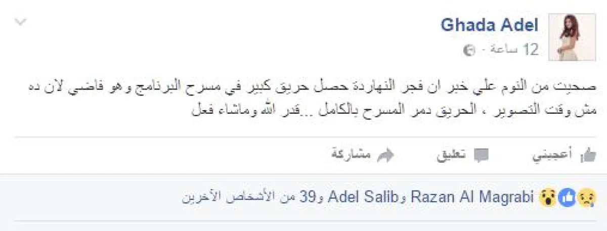غادة أكدت أنها فوجئت بخبر الحريق فور استيقاظها من النوم وقالت عبر حسابها الخاص بموقع الفيس بوك: صحيت من النوم علي خبر ان فجر النهاردة حصل حريق كبير في مسرح البرنامج وهو فاضي لأن ده مش وقت التصوير ، الحريق دمر المسرح بالكامل ...قدر الله وما شاء فعل.
