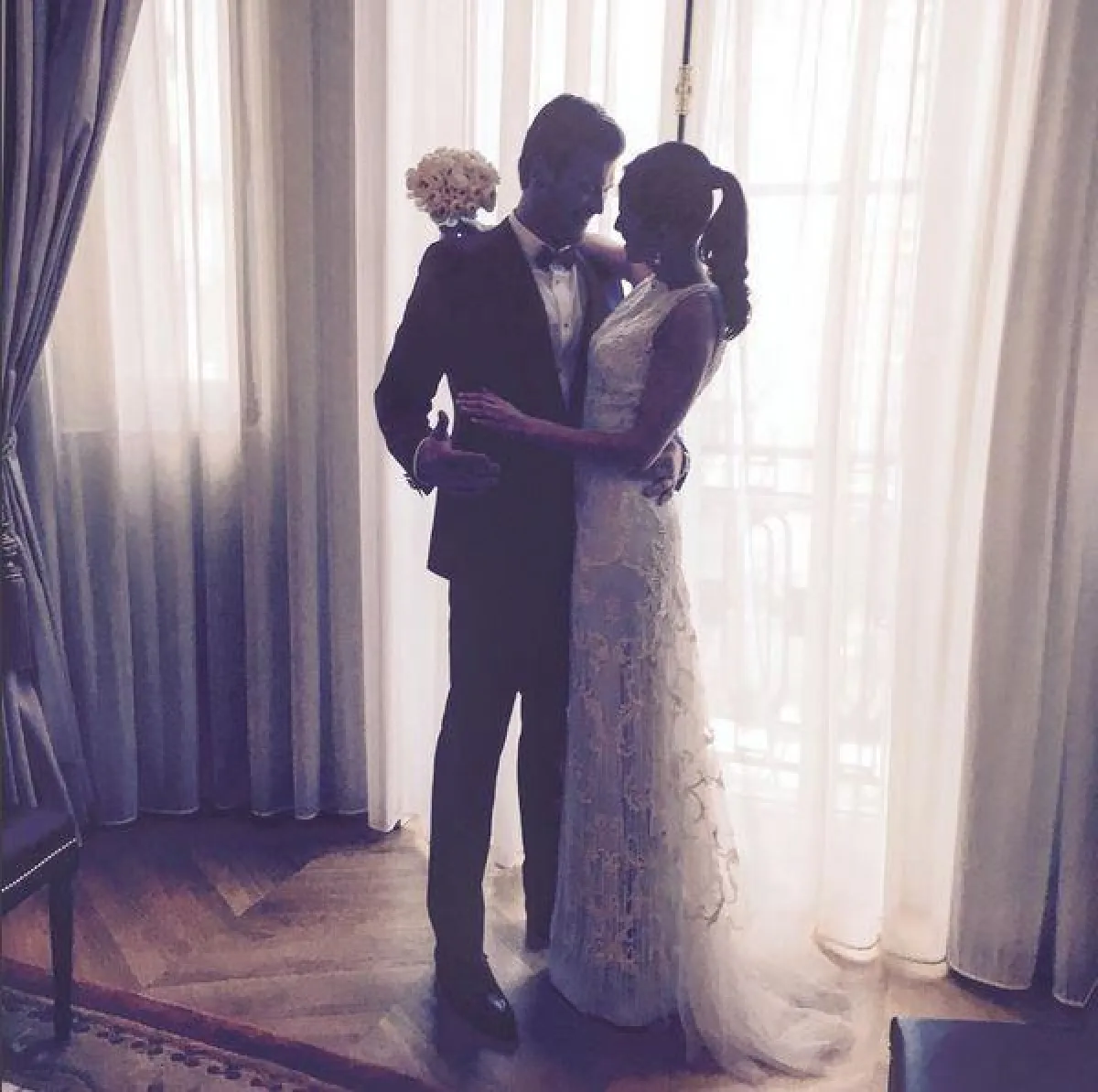 *تألقت العروس مصممة الأزياء بفستان زفاف أبيض بسيط وأنيق مطرز يدوياً، أبرَزَ جمالها الطبيعي، مع تسريحة ذيل الحصان الناعمة، التي أبرزت نعومة وجهها، صمّمه لها خصيصاً وقدّمه هدية زفاف لهما، صديقهما مصمم المشاهير التركي أوزغور ماسور .