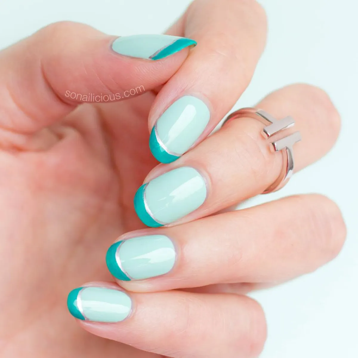 - ارسُمي خطاً مائلاً بمحاذاة أظافرك على الجانب الأيسر. باستخدام الفرشاة التي تأتي مع الزجاجة، ارسُمي خطاً مائلاً باستخدام لون من الوان الباستيل من اختيارك. تشيلسي Chelseaتستخدم الظلّ الأخضر النعناعي، ولجعله سهلاً قدر الإمكان، نبدأ برسم خطٍ مائلٍ رقيق، وتدريجاً نضيف طبقات أخرى لجعله أكثر سمكاً.