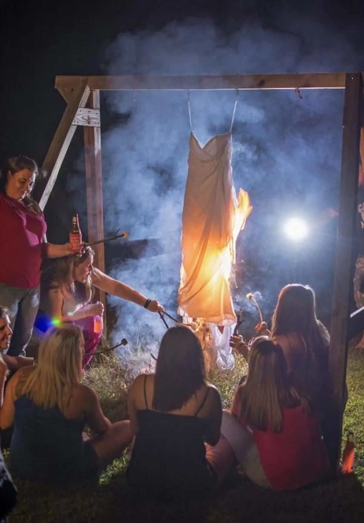ووفقًا لـ«العربية»، فقد باتت لحفلات الابتهاج بالطلاق طقوس، أهمها إعداد موقع آمن لإشعال النيران في فستان الزفاف، الرمز الكبير الذي يربط الزوجين أكثر من أي شيء آخر، حيث تشعل المطلقة النار في فستان زفافها، ويشاركها المدعوون في إذكاء النيران؛ بنثر حلوى «المارشميلو» على الحريق، وفي بعض الحفلات استأجرت نساء مصورين محترفين؛ لتوثيق لحظة إحراق فستان الزفاف، في نكاية واضحة بالطليق.