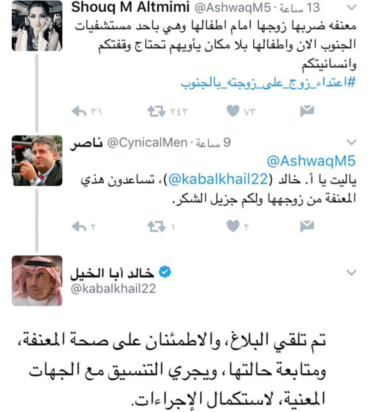 يشار إلى أن الـ "هاشتاق" تضمَّن التغريدة التالية: "معنَّفة ضربها زوجها أمام أطفالهما وهي في أحد مستشفيات الجنوب الآن، وأطفالها بلا مكان يؤويهم. تحتاج إلى وقفتكم وإنسانيتكم".
