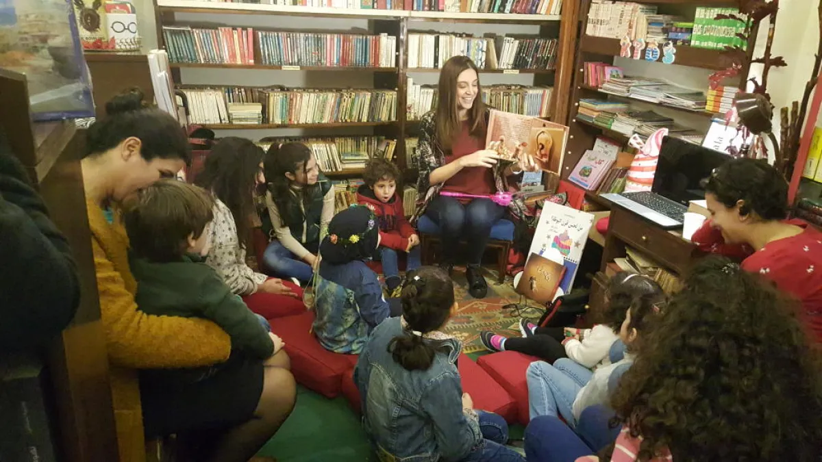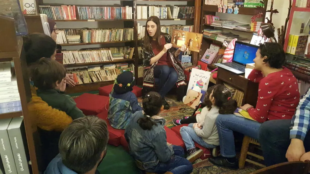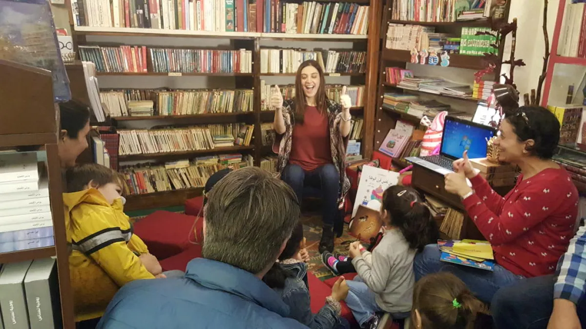 شاهد الكاتبة وهي تقرأ كتاب "حلتبيس، حلتبيس" داخل المكتبة