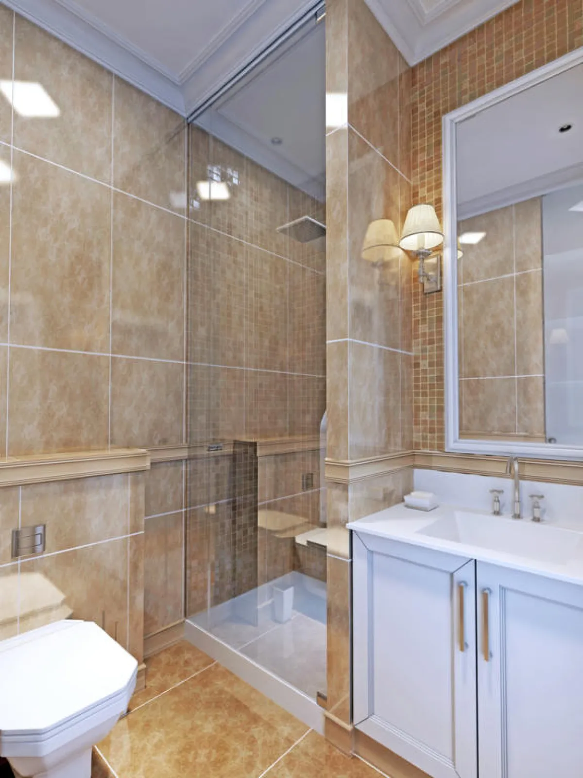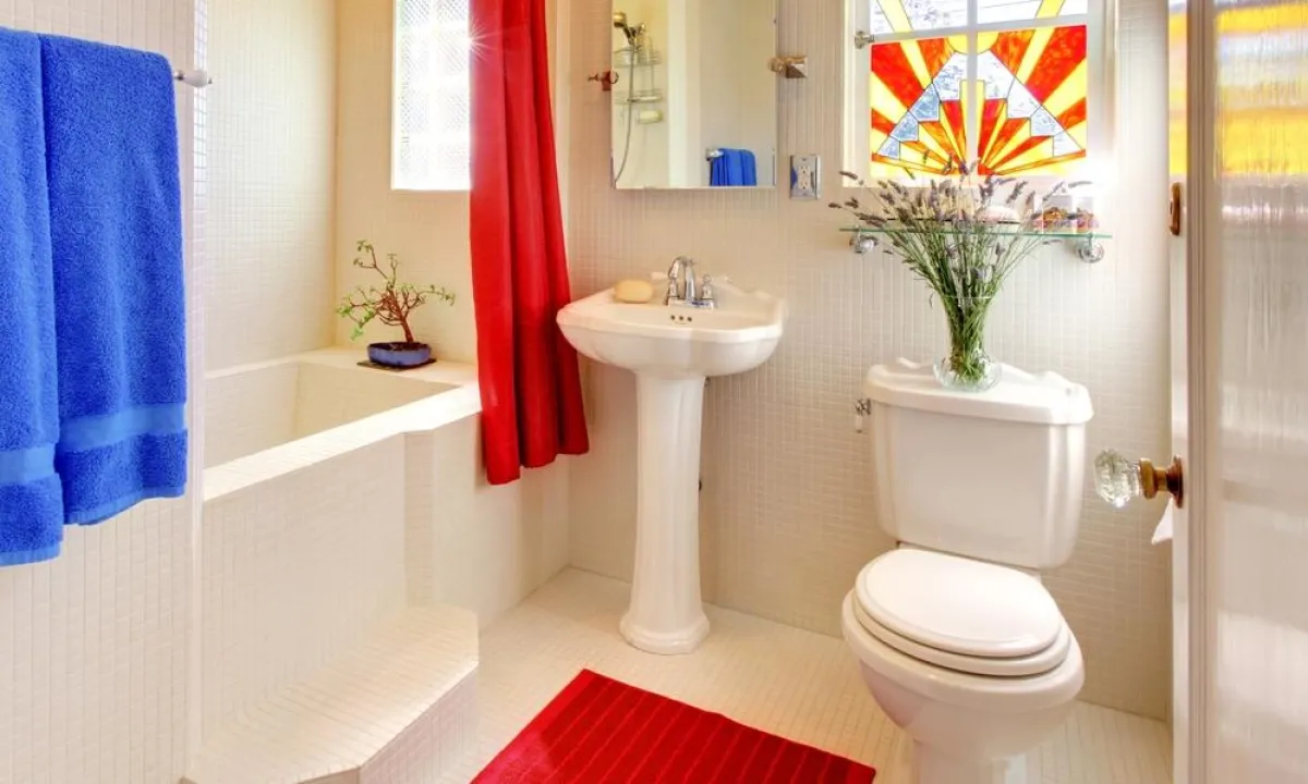 من المفضّل أن تكون الخامات الأساسيّة في دورة المياه، باللون الأبيض أو البيج الفاتح