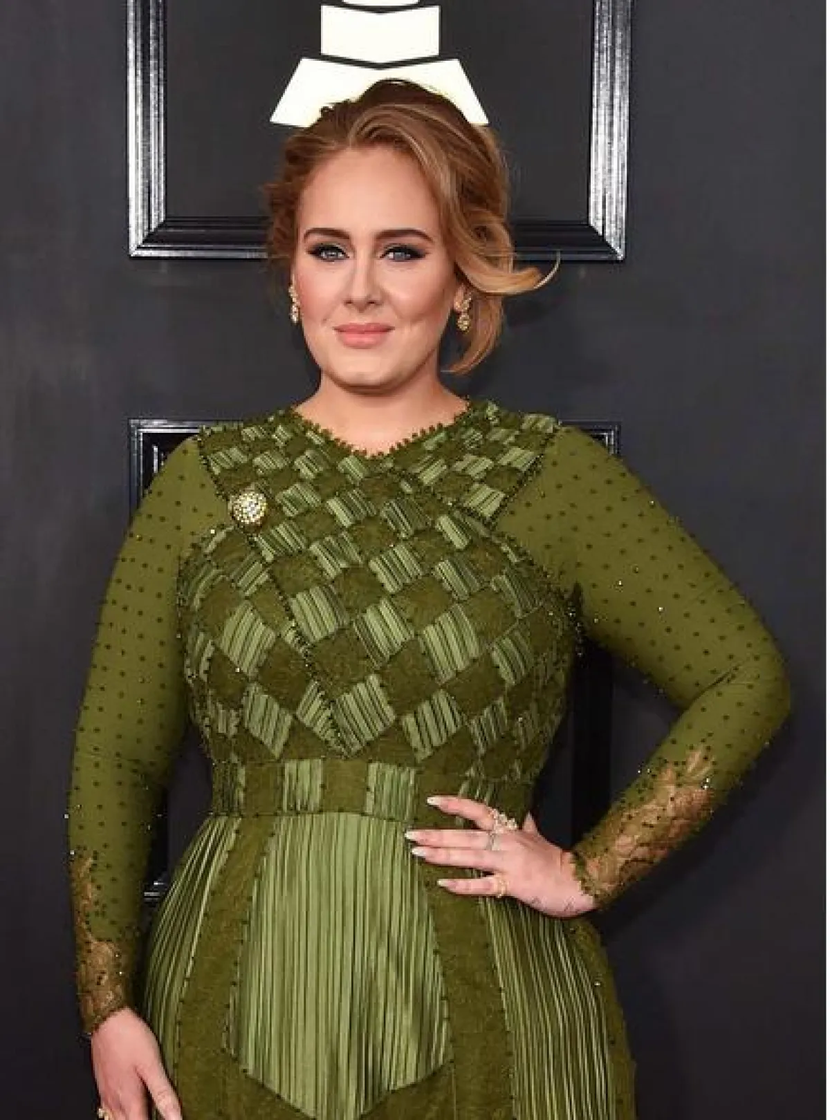 أديل Adele: تميزت بمكياجها الطبيعي مع القليل من الـ"أيلاينر" والكحل الأسود الذي يُعتبر مناسباً لرفعة شعرها العفوية.