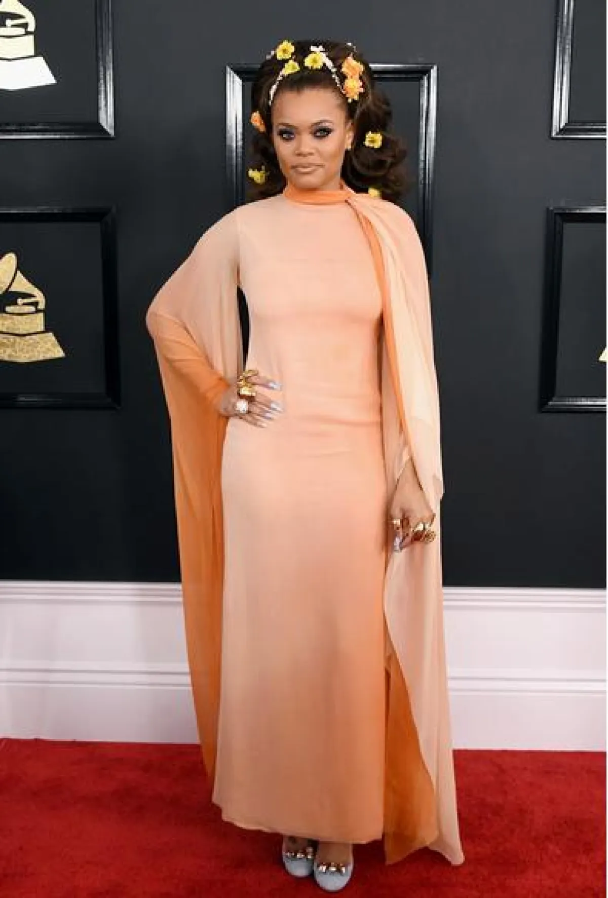 أندرا داي Andra Day: من الصيحات الغريبة كانت أظافر هذه النجمة الزرقاء مع الاكسسوارات. اضافة الى الورود الصفراء الموزعة على شعرها المرفوع.