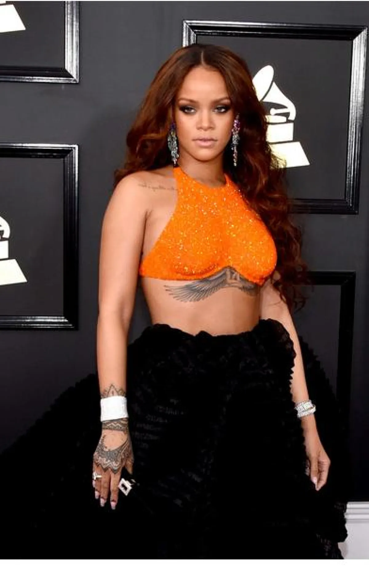 ريهانا Rihanna: صبغت شعرها باللون النحاسي مع الشعر المستعار الطويل المنسدِل بشكل تموجات عريضة والفرق النصفي. يُعتبر هذا اللون من الشعر من آخر صيحات الموضة لهذا الموسم ولا سيما لصاحبات البشرة السمراء.