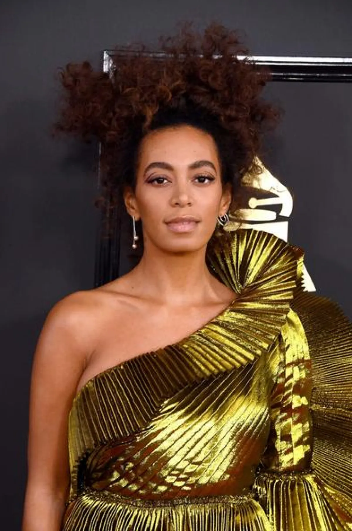 سولانج Solange: اكتملت الغرابة مع هذه النجمة، ليس فقط بتسريحة شعرها المجعّد المرفوع بشكل عفوي، وانما أيضاً بطريقة رسم الـ"أي لاينر" الغرافيكي بشكل قوس على الجفن العلوي.