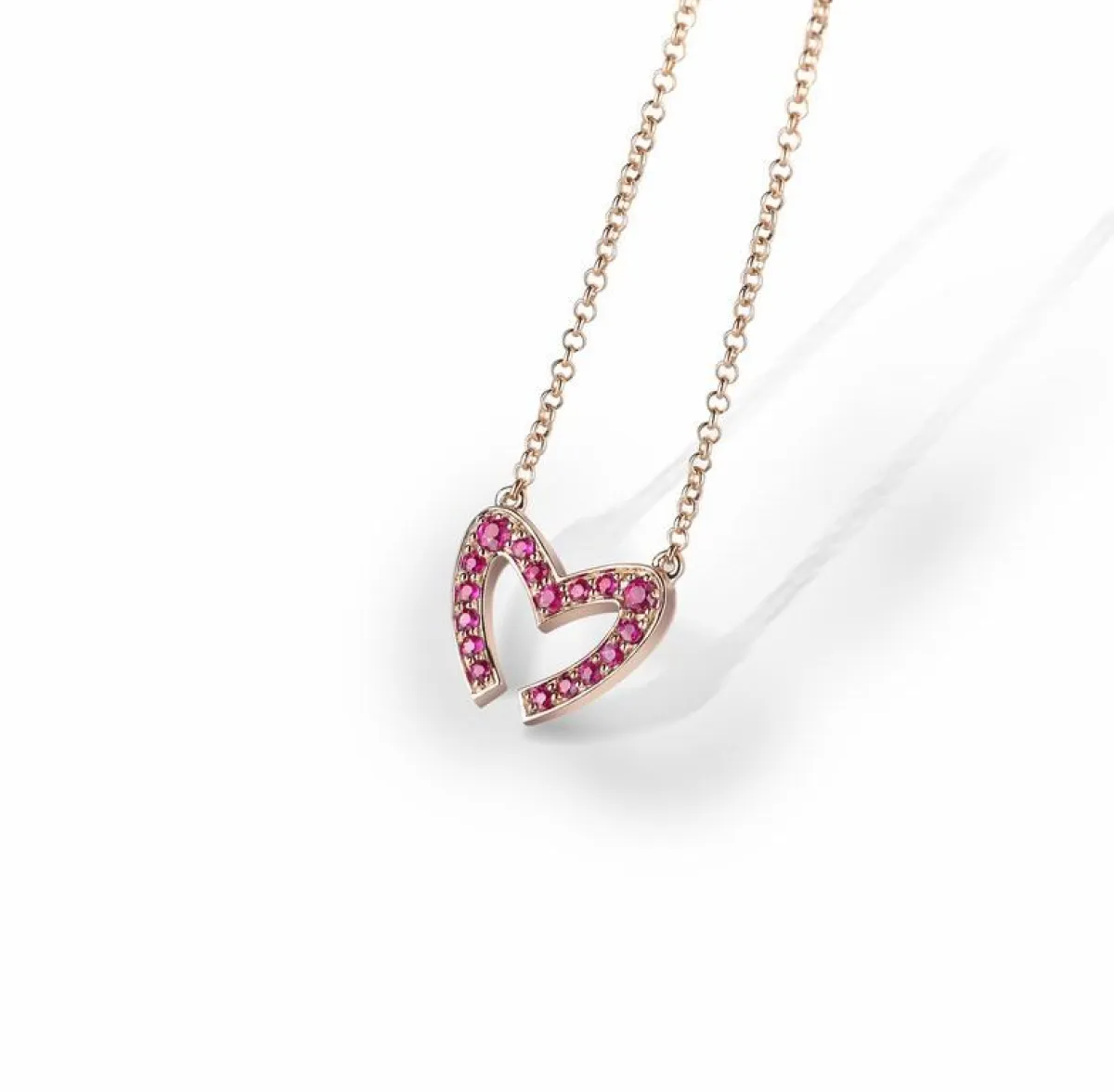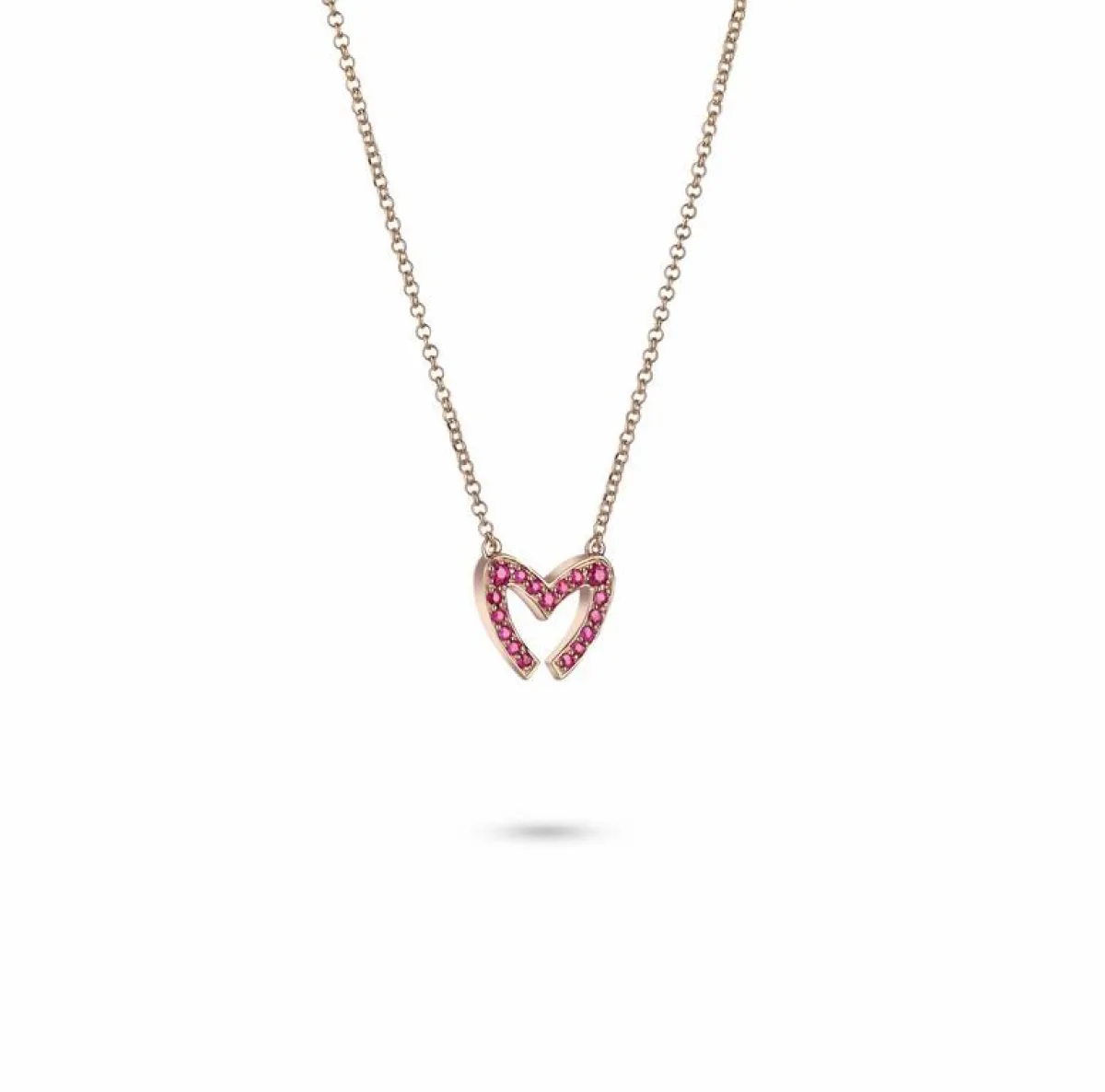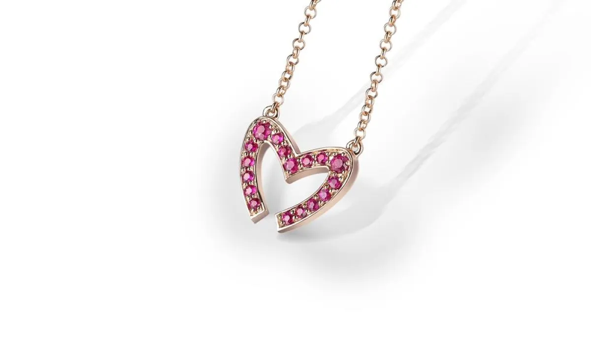 وقد استوحي تصميم هذه القلادات من رسم القلب المشكل على هيئة حرف "إم" M المميز لشعار مجموعة معوّض والظاهر على جميع تصاميمها، لتعبّر التشكيلة عن مشاعر الحب الغامرة وترسم لوحة باهرة للقلب بالذهب الوردي عيار 18 قيراطًا المرصع بأجود أنواع الياقوت الأحمر.وقد استُخدمت أدق التقنيات وأحدثها لوضع اللمسات الجمالية الأخيرة على كافة قطع هذه المجموعة، ويتجلى ذلك في تشكيل الذهب الوردي العاكس كالمرايا، وفي ترصيع القطع بالياقوت. كما وترضي هذه القلادات بتصميمها البسيط والمعاصر جميع الأذواق وتناسب كافة المناسبات.