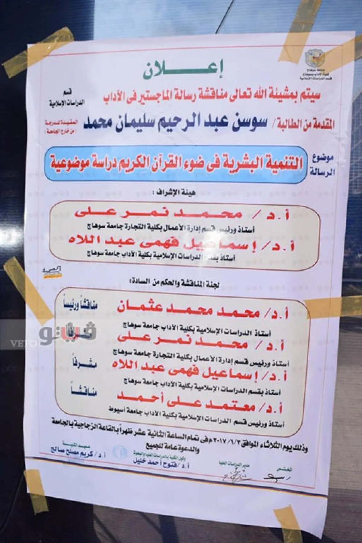 «التنمية البشرية في ضوء القرآن الكريم» هي أول رسالة ماجستير للباحثة سوسن عبدالرحيم «كفيفة»، تعمل مدربة للحاسب الآلي لضعاف وفاقدي البصر، بمركز نور البصيرة بجامعة سوهاج - بجنوب صعيد مصر - وهى تقيم بقرية كوم العرب، دائرة مركز طما، شمال محافظة سوهاج.
