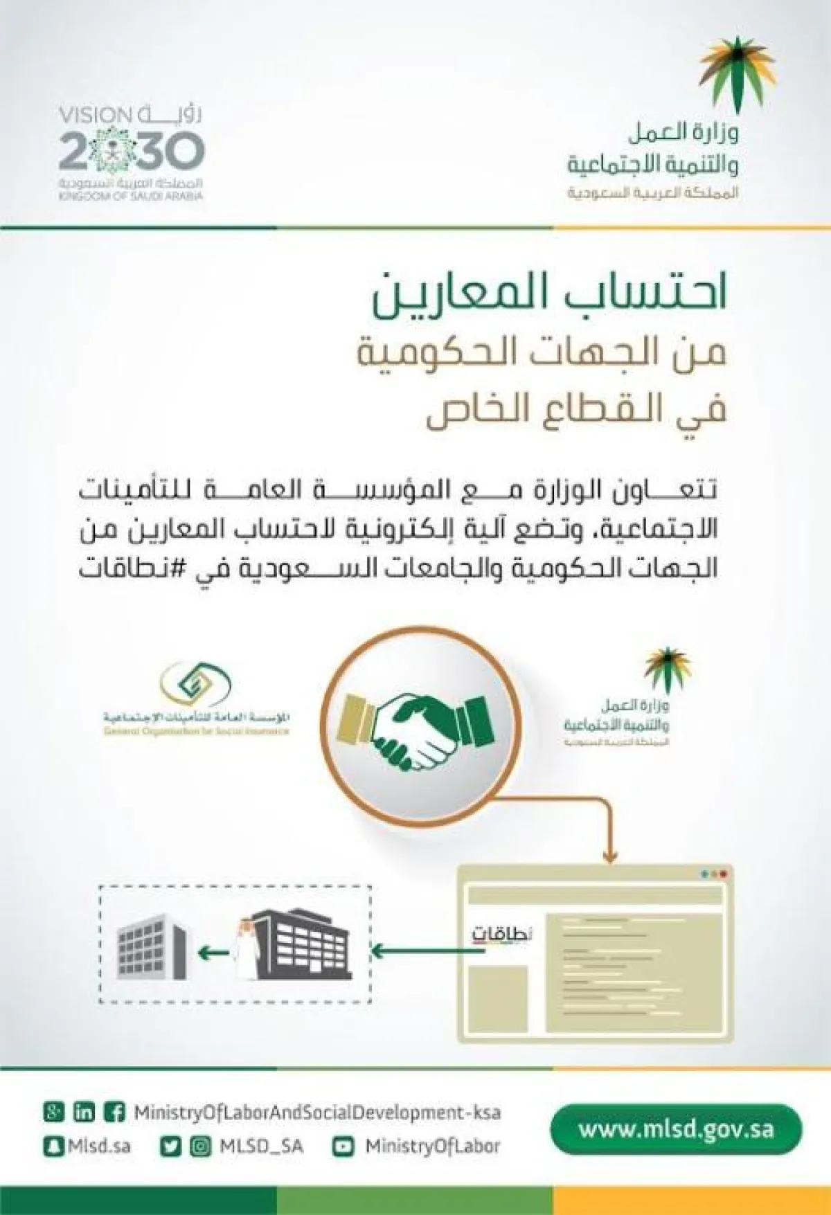 وبينت الوزارة أنَّ أصحاب العمل (القطاع الخاص) بإمكانهم تعبئة طلب ضم المعارين ضمن «نطاقات»، من خلال البوابة الإلكترونيَّة للمؤسسة العامَّة للتأمينات الاجتماعيَّة، حيث يقوم صاحب العمل بتزويد المؤسسة ببيانات الإعارة على أن تقوم المؤسسة بالتأكد من هويَّة المعار بأنَّه يخضع لنظام الخدمة المدنيَّة عن طريق الربط مع مركز المعلومات الوطني، وقبول الطلب تلقائيًا.