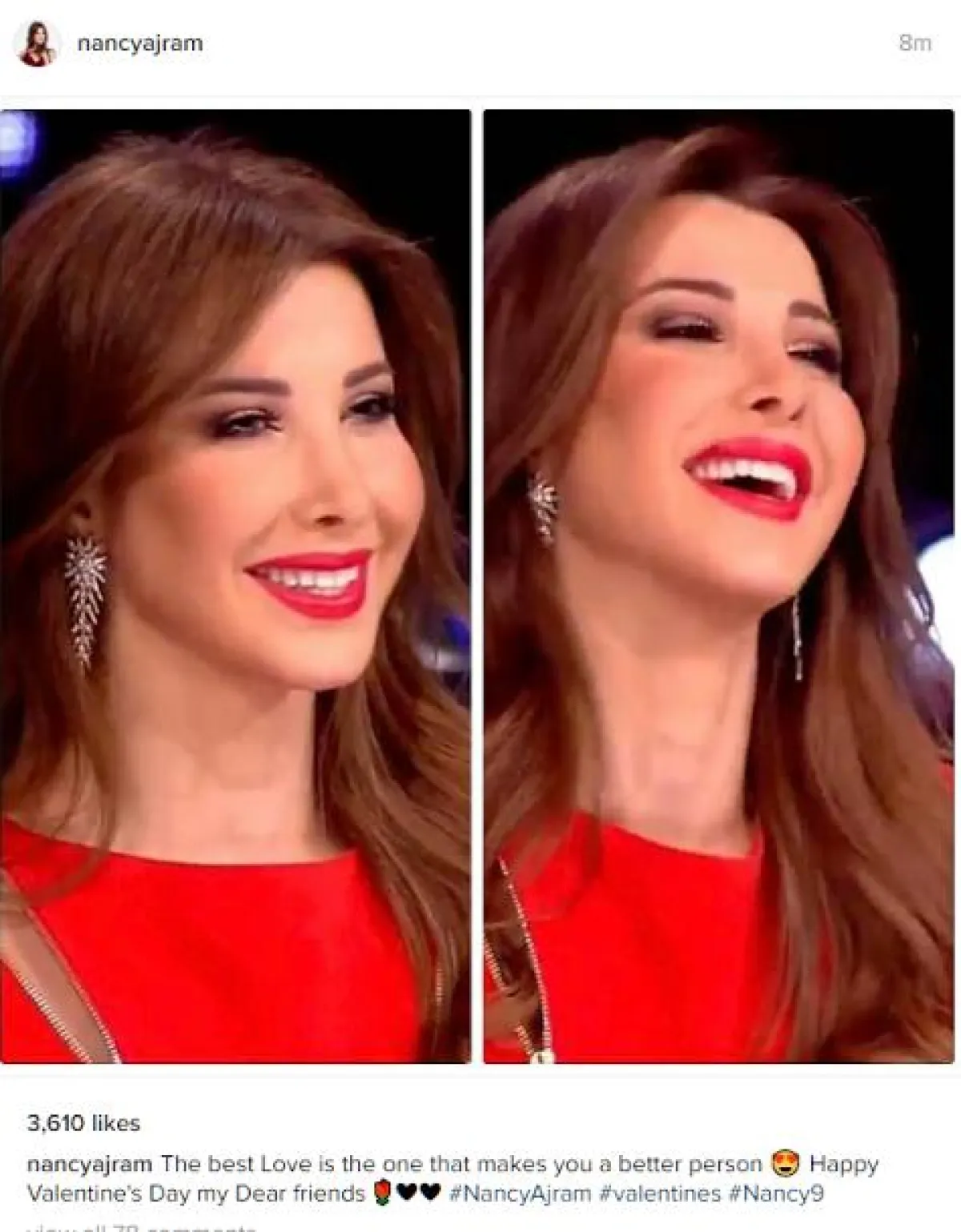 نانسي عجرم اختارت الظهور باطلالة باللون الحمر ووضعت معها حكمة تقول: "أجمل حب الذي يجعلك أفضل إنسان".