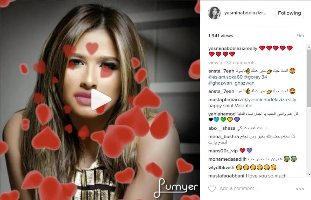 النجمة مي عز الدين استخدمت تطبيقات إنستقرام لانتاج مقطع فيديو يظهرها وكانها تردد كلمة "أحبك"، وهو نفس ما فعلته النجمة ياسمين عبد العزيز ولكنها ظهرت في المقطع وكأنها تمنح قبلات متتالية لجمهورها مع هيمنة القلوب الحمراء، واكتفت نجمة ستار أكاديمي رنا سماحة بنشر صورة لها من جلسة تصوير خضعت لها خصيصاً بمناسبة يوم العشاق ونشرتها بدون تعليق.
