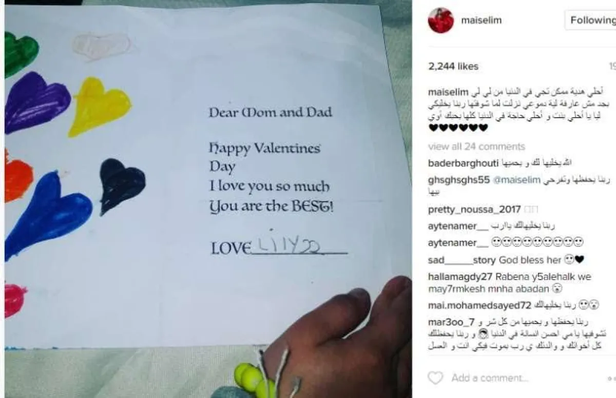 كما كشفت الفنانة مي سليم عن أحلى هدية تلقتها بمناسبة عيد الحب، وهي رسالة رقيقة من ابنتها "لي لي"، تخبرها بها بحبها وأنها أفضل أم، ونشرت صورة من الرسالة عبر حسابها على موقع إنستقرام، معلقة عليها قائلة: "أحلى هدية ممكن تجي في الدنيا من لي لي بجد مش عارفة لية دموعي نزلت لما شوفتها ربنا يخليكى ليا يا أحلى بنت وأحلى حاجة في الدنيا كلها بحبك أوي".