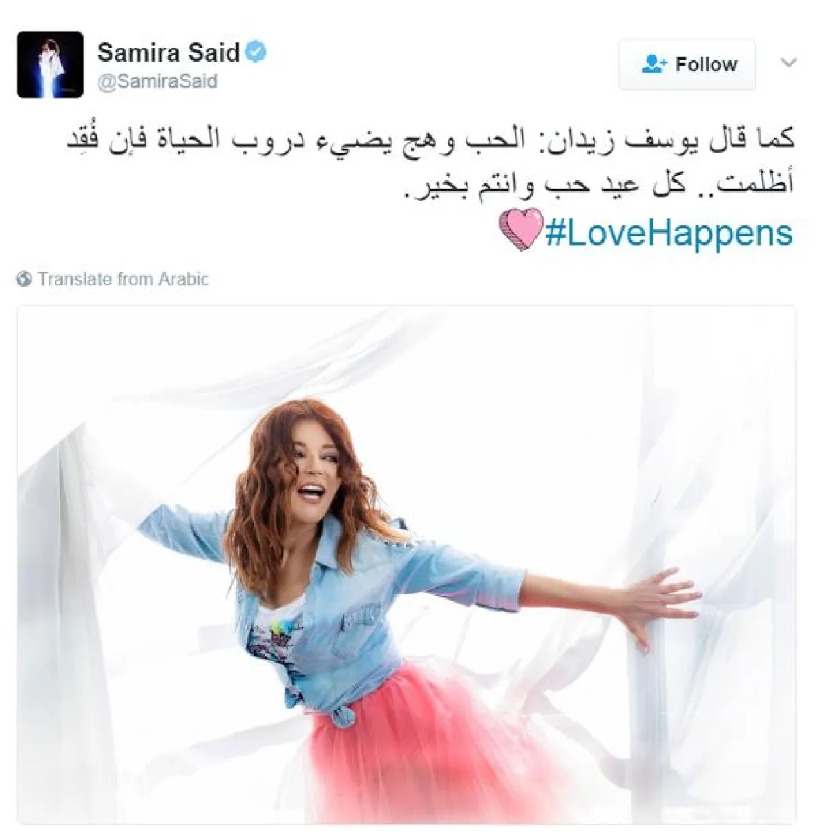 المطربة المغربية سميرة سعيد استعارت مقولة من الروائي والمفكر المصري د.يوسف زيدان قائلة: "كما قال يوسف زيدان: الحب وهج يضيء دروب الحياة فإن فُقِد أظلمت.. كل عيد حب وانتم بخير".