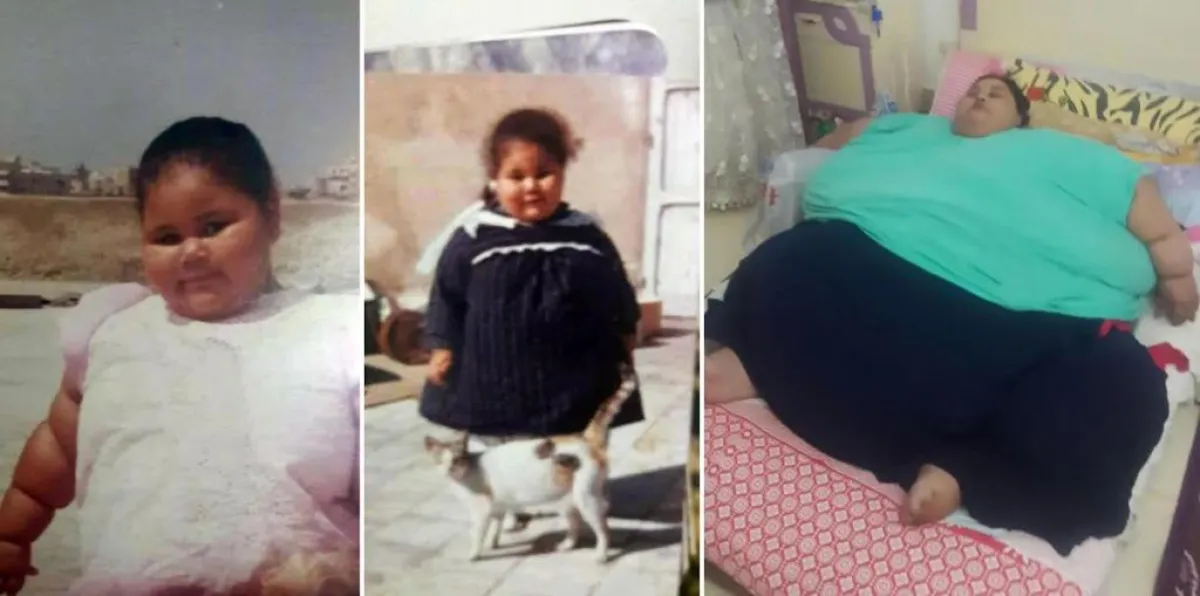 تزن إيمان- 36 عاماً - 500 كيلوجرام وطولها يبلغ 141 سم وهي قادرة على الجلوس فقط ولا يمكنها الحركة، وتسببت السمنة المفرطة في حدوث خلل كبير في الهرمونات وارتفاع ضغط الدم وتعاني فرطاً في نشاط الغدة الدرقية والنقرس ومرض السكري وصعوبة التنفس أثناء النوم .