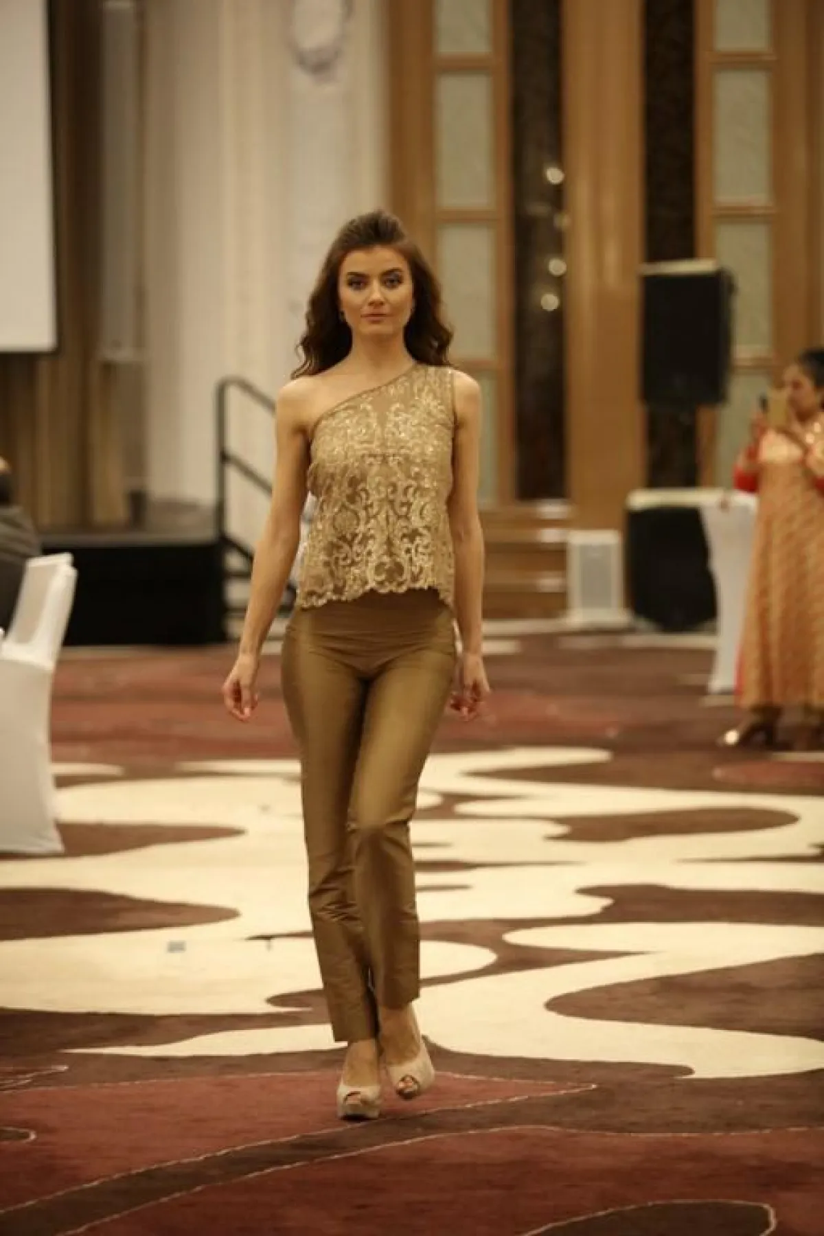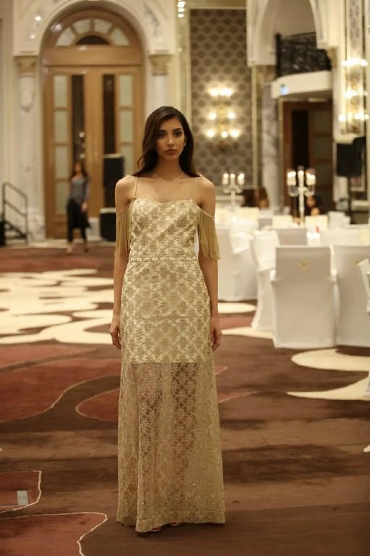 حيث اعتمدت المجموعةُ على الفساتين المزيّنة بالتفاصيل البرّاقة والقُماش اللامع من الترتر، بالإضافة إلى عرض بنطالون الجلد بالوان المعدِن الذهبيّة، التي تميّزت بأناقة لافته ، ضمّت المجموعة صيحاتٍ عدة لافته، كان ابرزَها الفستانُ مع الكاب الشيفون المزيّن بأزهار الدانتيل ، كذلك الفستان المزيّن بأكتاف الشراريب الـ Fringe، التي برزت هذا العام بقوة ، وتألّق كذلك الدانتيل المطرّز بالفصوص اللامعه في الفساتين المعروضة ، أتت معظم الفساتين بقصّات مكشوفة من على الصدر