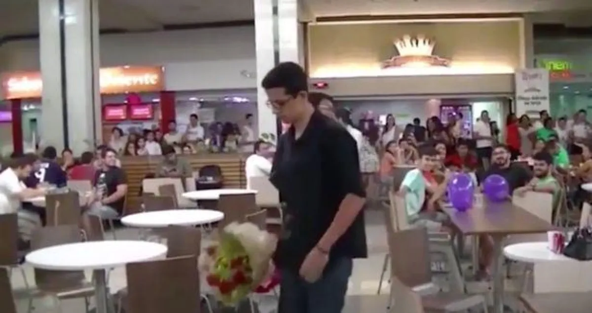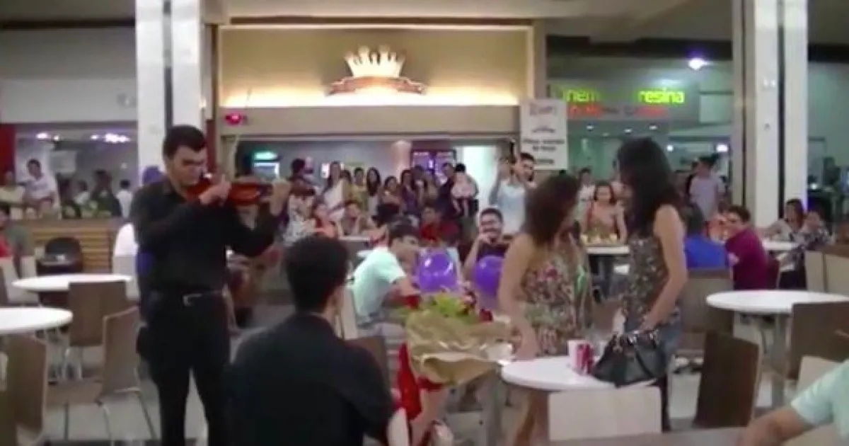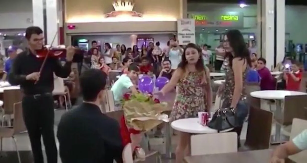 ونشرت صحيفة mirror البريطانية فيديو للشاب الذي استقدم عازف كمان في أحد المطاعم الشهيرة بالبرازيل، حيث أخذ عازف الكمان فى عزف النغمات الرومانسية بالقرب من الفتاة التي كانت بصحبة صديقتها، بعدها تقدم الشاب يحمل باقة من الزهور ونزل على ركبة واحدة معلنًا حبه وطلبه الزواج منها على الأنغام الرومانسية، أمام المئات من رواد المطعم، ولكن رد فعل الفتاة جاء مختلفًا تمامًا وعكس المتوقع، حيث وقفت فى حيرة، وأنظار الجميع متجهة إليها تنتظر موافقتها على الزواج منه، ولكنها رفضت عرضه بالزواج منها، وسحبت حقيبتها بعد لحظات من التفكير وردود الأفعال المختلفة، لتترك المكان نهائيًا، وتضعه فى موقف محرج ومؤلم أمام المئات وهو يحمل باقة الزهور.