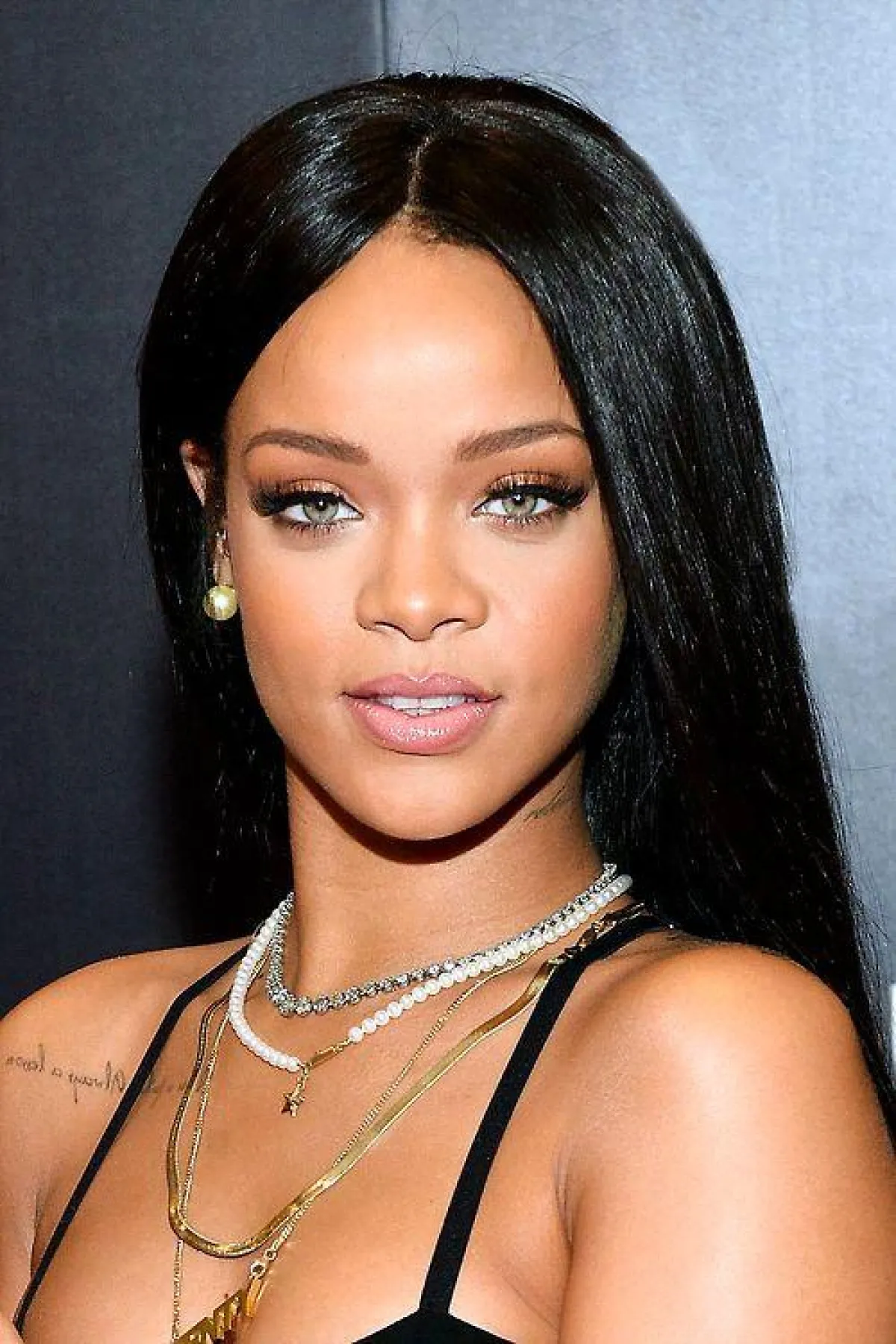 ريهانا ترتدي مجموعة من السلاسل الناعمة التصميم إضافة الى اللؤلؤ.