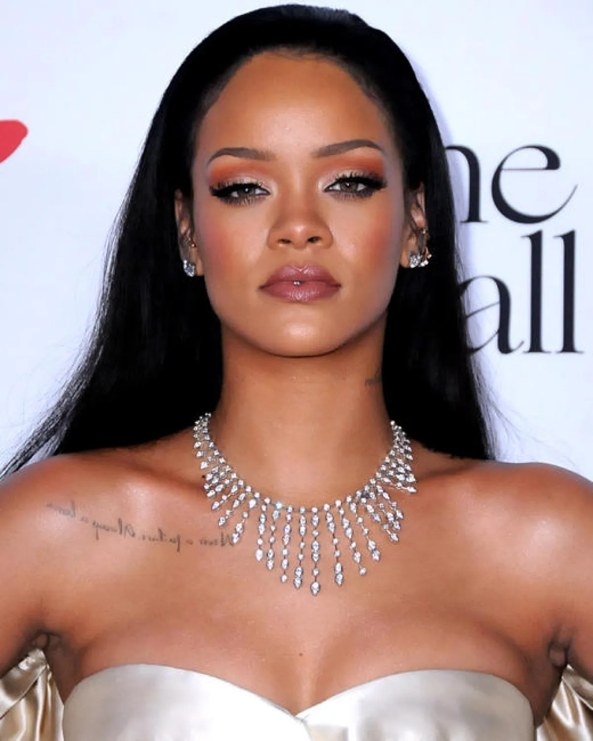 ريهانا الجريئة في مجوهراتها، ترتدي مجموعة سلاسل من الماس الأبيض.