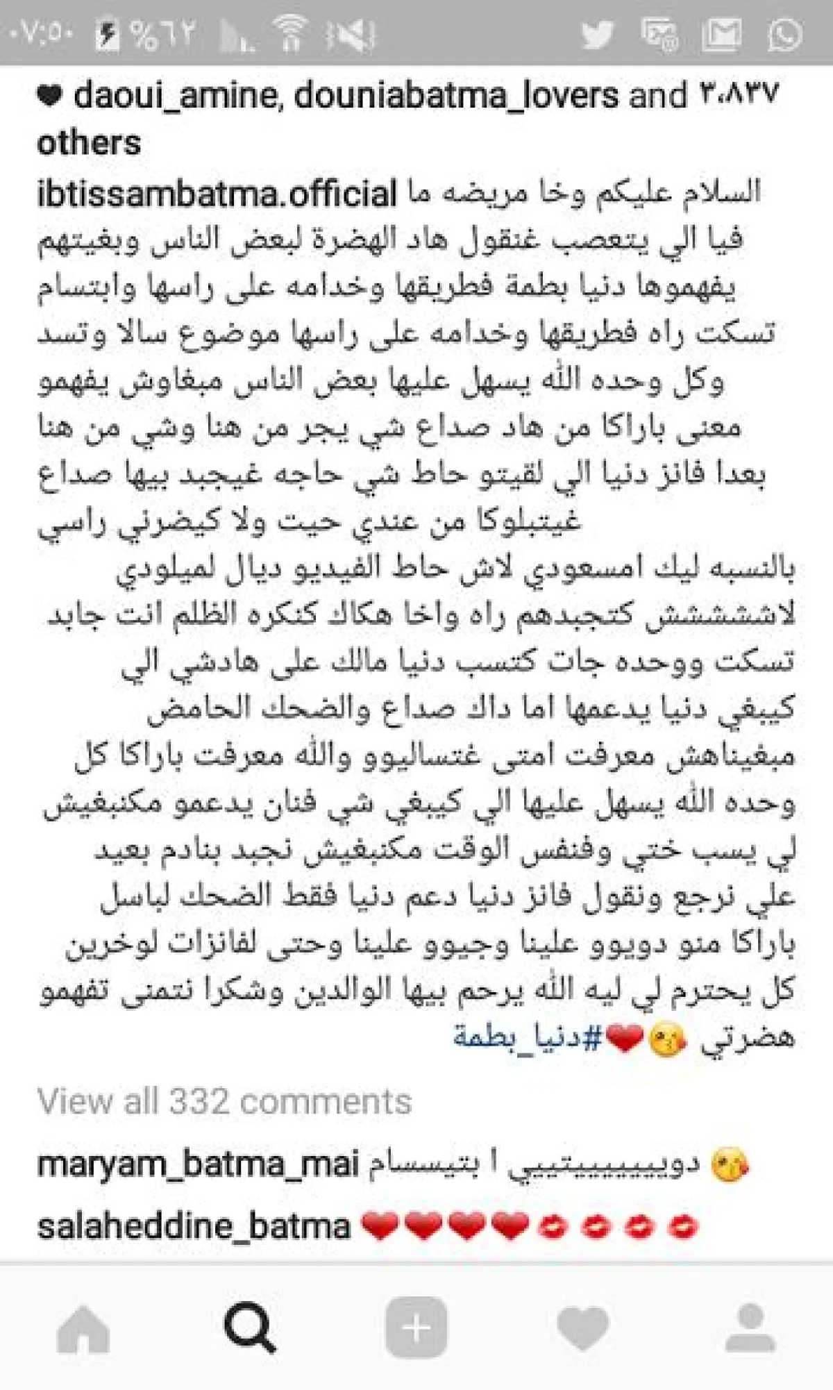 ونفت ابتسام باطمة شقيقة دنيا في تدوينة طويلة على موقع "إنستغرام" أي خلاف بين الطرفين، وأكدت أنّ "كل واحدة منهما ماضية في طريقها ومهتمة بعملها. أما موضوع الخلاف فقد انتهى منذ زمن طويل".