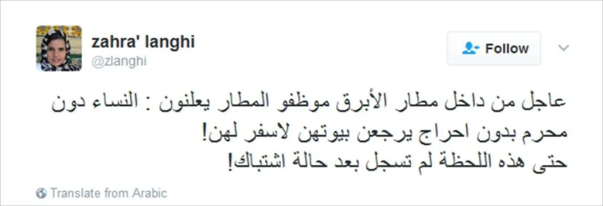 يبدو أن المرأة السعودية لم تعد الوحيدة الغير قادرة على السفر بدون محرم، حيث أصدر الحاكم العسكري لمنطقة درنة -بن جواد في شمال شرق ليبيا عبدالرزاق الناظوري قراراً بمنع سفر النساء الليبيات دون سن الستين سنة إلى الخارج من غير محرم "من غير رجل قريب لهن داخل عائلاتهن".