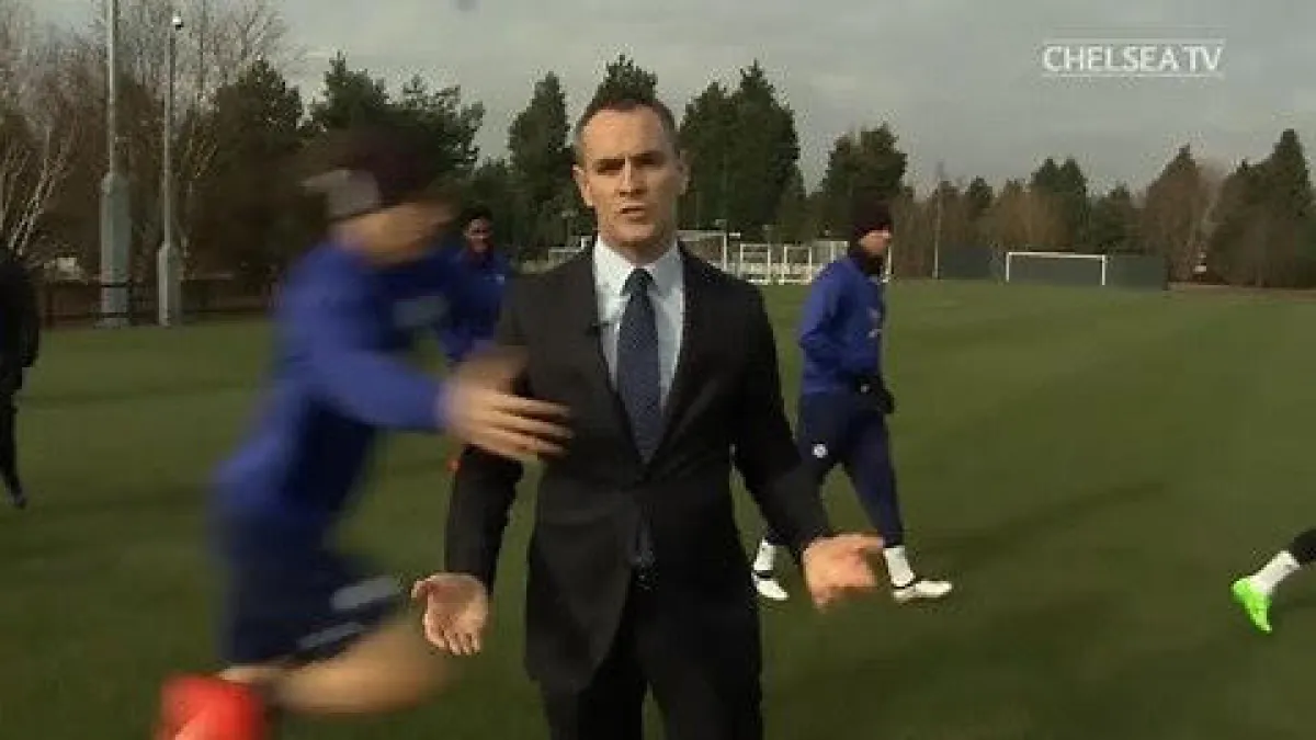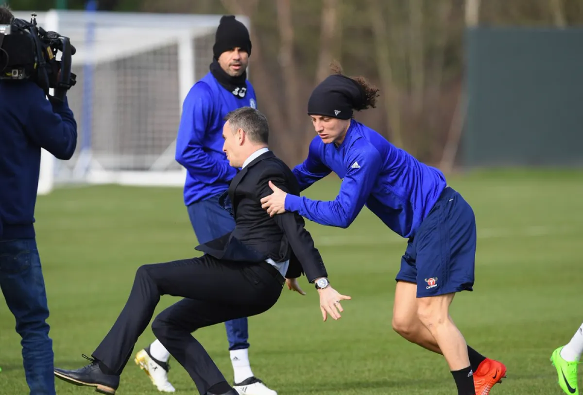 في لقطة رائعة أثارت إعجاب الملايين من مشجعي فريق تشيلسي الإنجليزي الشهير، قام لاعب الفريق ونجم منتخب البرازيل «ديفيد لويز» أثناء التدريب بالهجوم على مذيع قناة تشيلسي أثناء تقديمه فقرة لمتابعة تدريبات الفريق على الهواء.