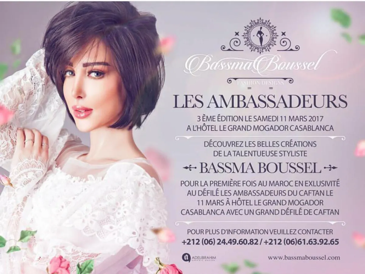 شاركت الفنانة المغربية المعتزلة بسمة بوسيل وزوجة الفنان تامر حسني ومصممة الأزياء على موقع التواصل الاجتماعي "إنستقرام" صورة إعلان أول عرض أزياء خاص بها بتظاهرة "سفراء القفطان"، في دورته الثالثة، المقرر تنظيمه يوم 11 مارس المقبل بالدار البيضاء.