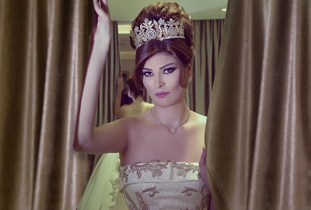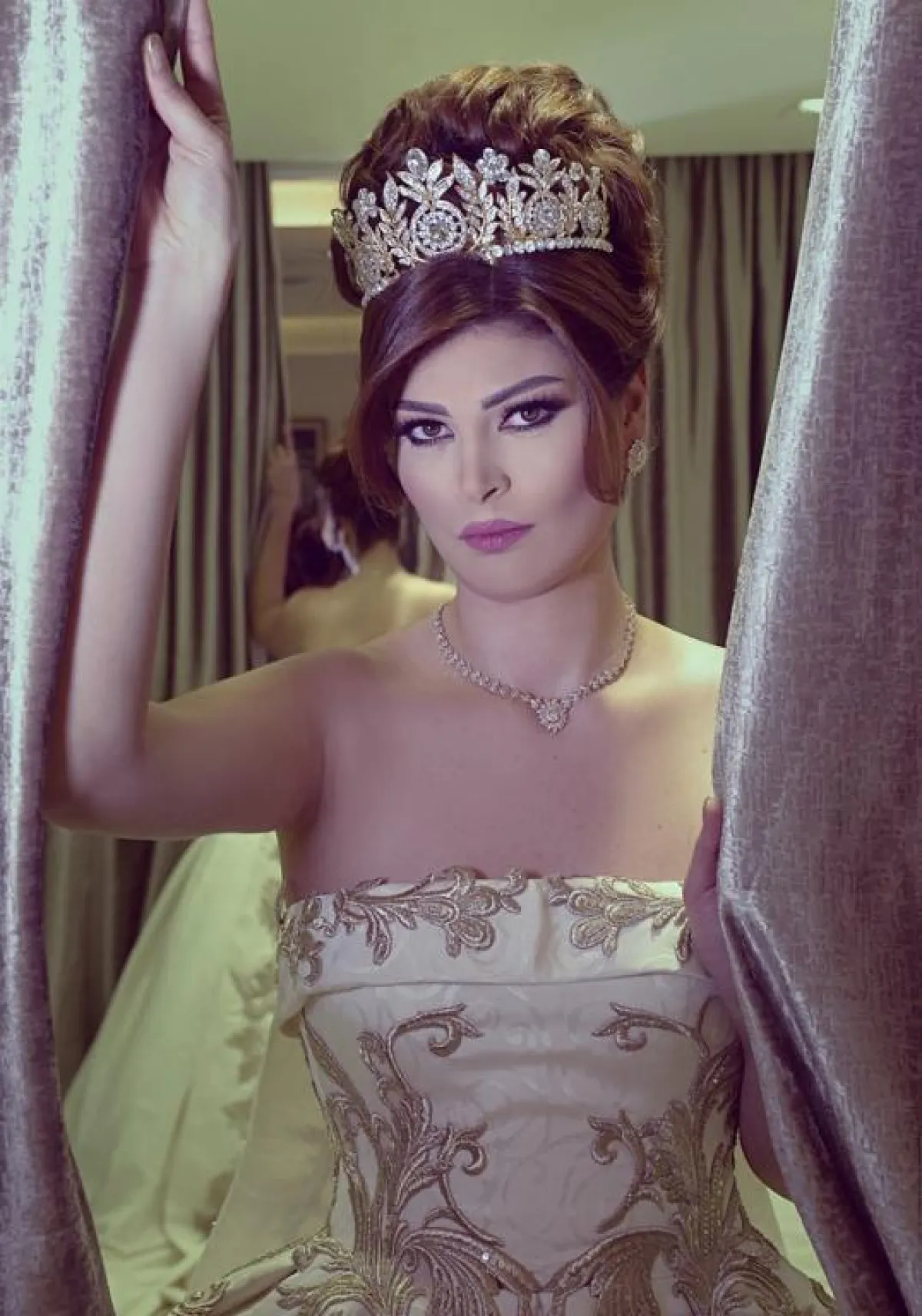 المكياج بأنامل خبير التجميل أحمد أحمد، التسريحة من صالون إدغار وميشال، الفستان من تصميم اللبناني نجا سعادة.